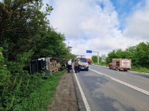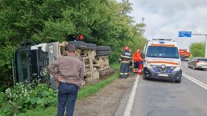 Un accident rutier s-a produs, miercuri dimineață, pe drumul european E58, pe raza localității Baisa. Un camion al firmei Agremin Trans SRL Botoşani s-a răsturnat pe marginea drumului.
