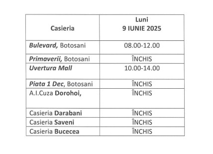 Societatea Nova Apaserv SA a anunțat programul casieriilor de Rusalii. Astfel, luni 9 iunie, toate casieriile vor fi închise cu excepția a două dintre ele. Casieria de pe Bulevard va funcționa în intervalul 08.12.00, iar cea de la Uvertura Mall în perioada 10.00- 14.00.