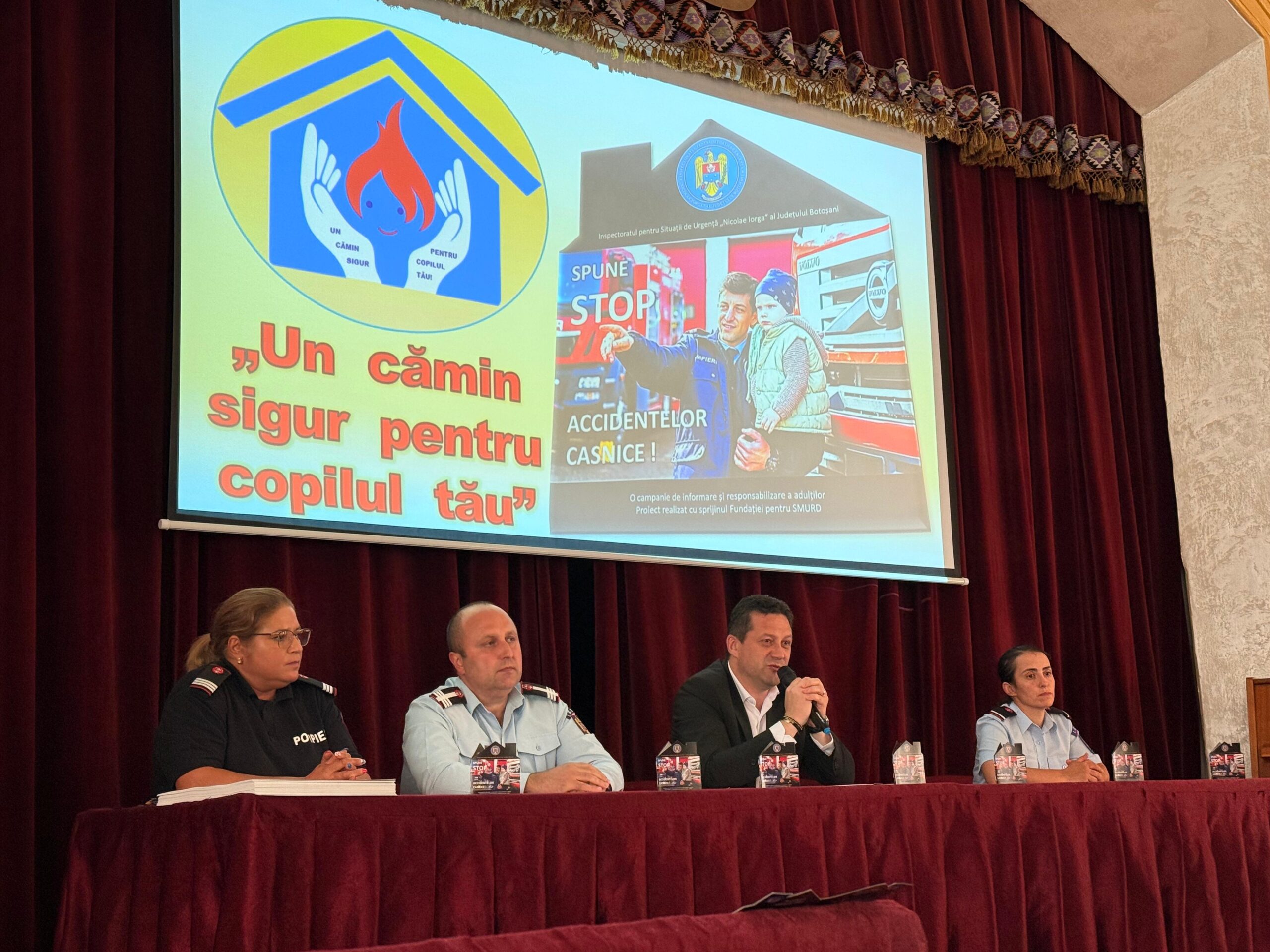 Campania de informare și educare preventivă „Un cămin sigur pentru copilul tău”, desfășurată lunar în județul Botoșani, a continuat, marți, cu o acțiune de informare și educare preventivă dedicată profesorilor, educatorilor și părinților, cu scopul de a preveni accidentele în care pot fi implicați copiii pe timpul vacanței de vară.
