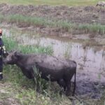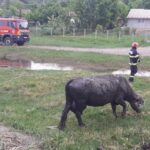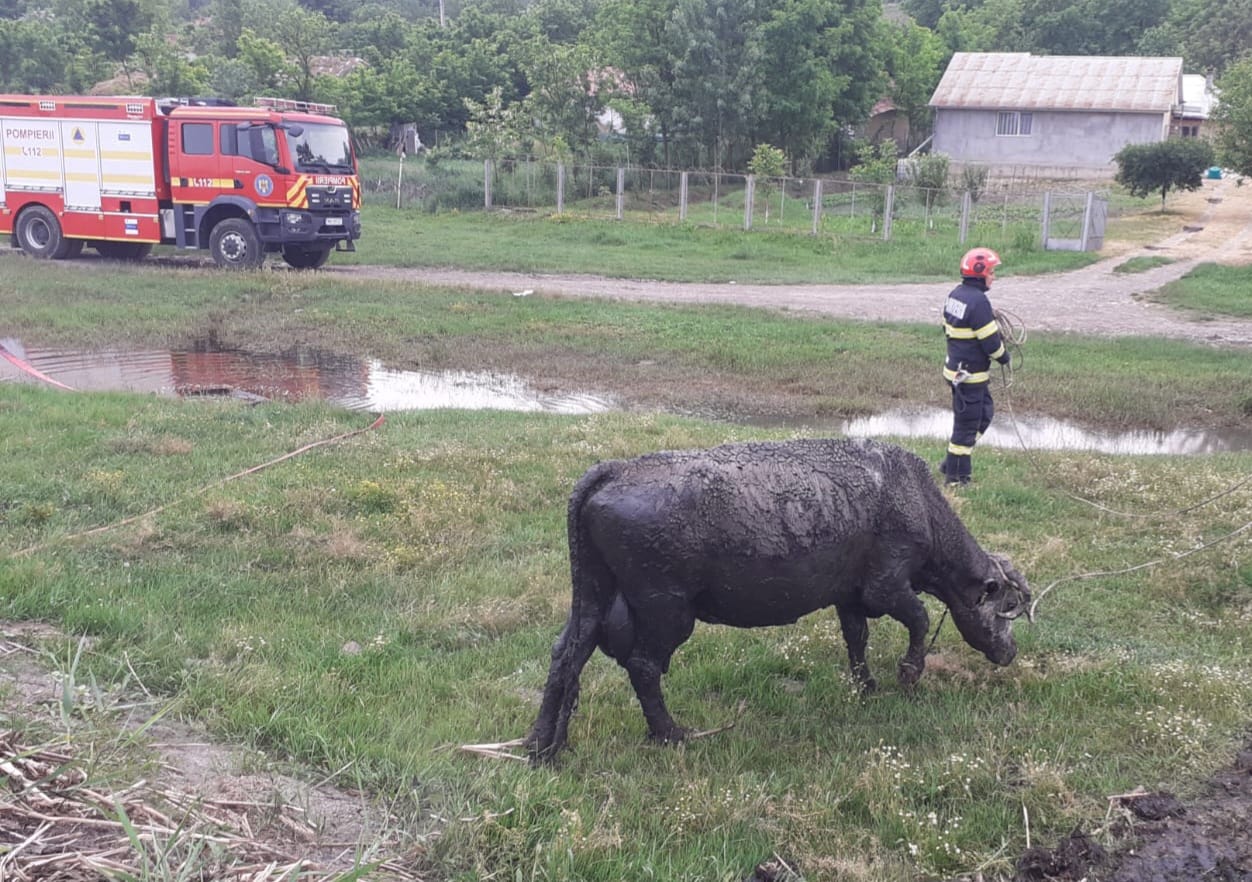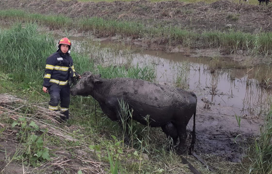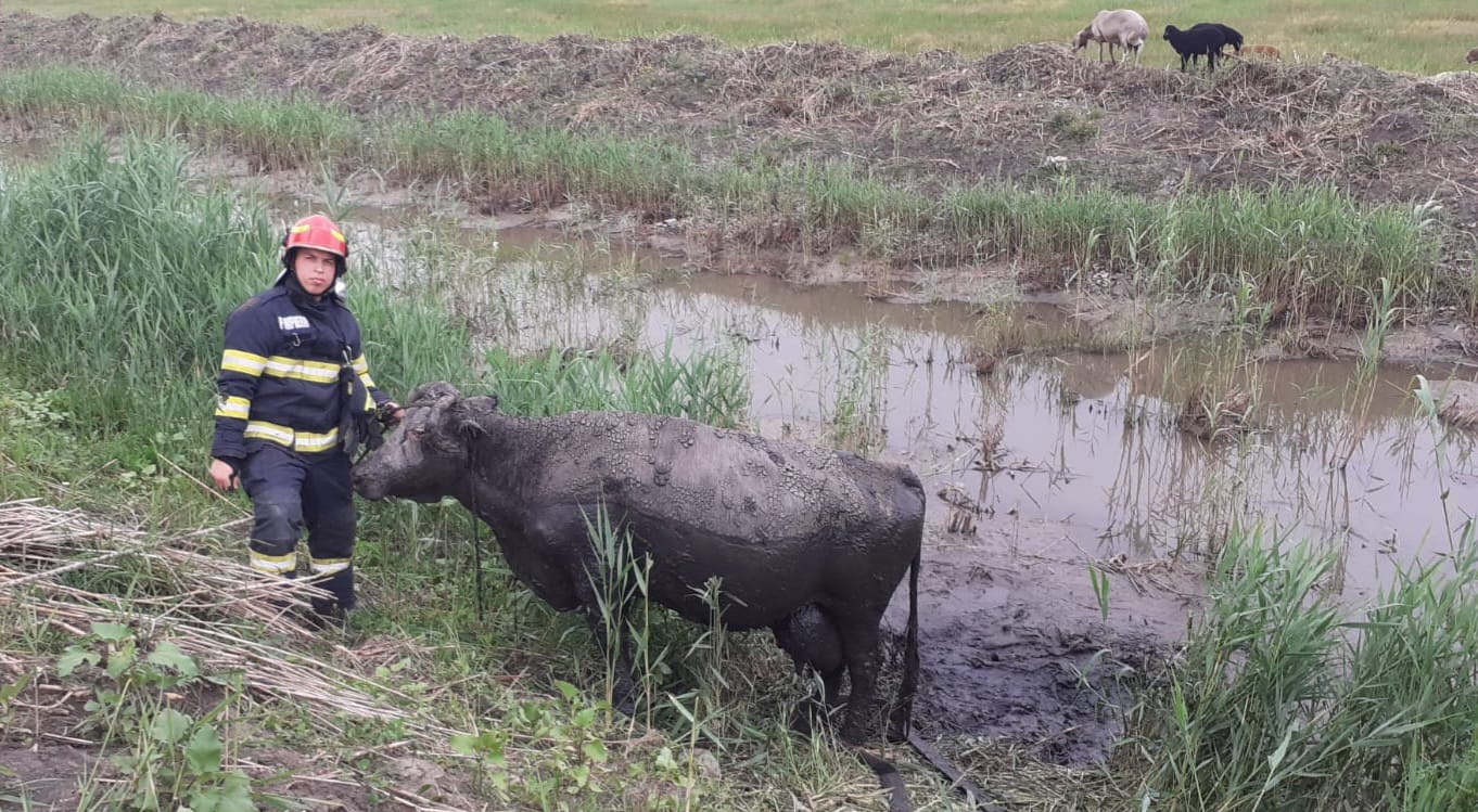 O intervenție neobișnuită a avut loc, miercuri în localitatea Petricani, unde o bovină a fost salvată de pompieri după ce a căzut în râul Bașeu. Cum a ajuns animalul în apă, nu știe nimeni. Când l-a găsit proprietara, era pe jumătate în mâl. A încercat să îl salveze, însă din cauza malului abrupt, eforturile sale au fost zadarnice.