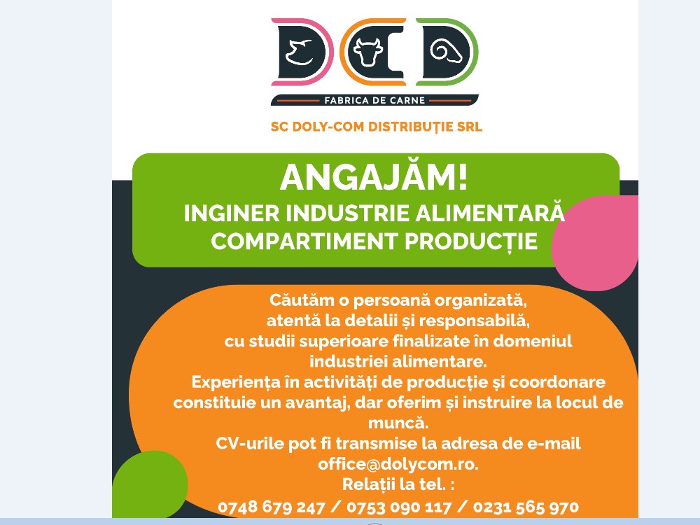 Căutăm o persoană organizată, atentă la detalii și responsabilă, cu studii superioare finalizate în domeniul industriei alimentare. Experiența în activități de producție constituie un avantaj, dar oferim și instruire la locul de munca.