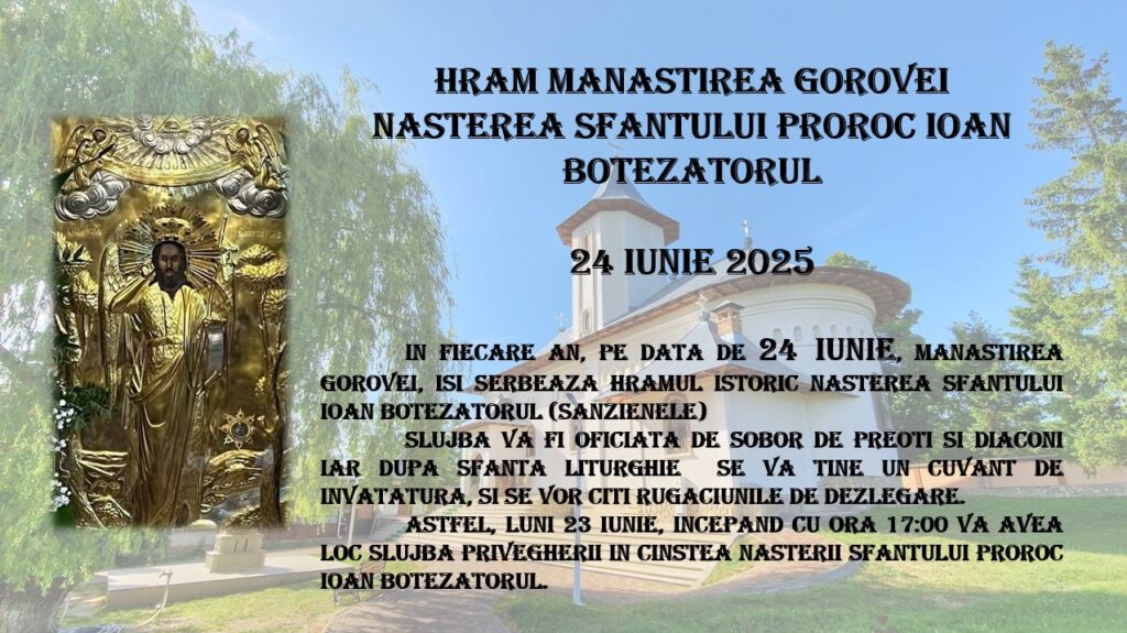 Mănăstirea Gorovei își serbează, marți, 24 iunie hramul istoric la Nașterea Sfântului Ioan Botezătorul (Sânzienele). Slujba Sfintei Liturghii va fi oficiata de către un sobor de preoți și diaconi. Se vor citi rugăciunile de dezlegare.