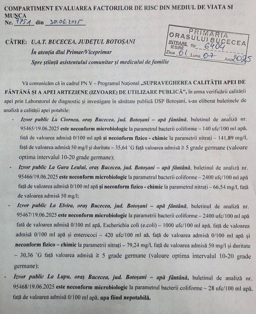 Toate izvoarele din Bucecea prezintă risc pentru sănătate, potrivit ultimelor rezultate de laborator care au ajuns în atenția primăriei. Apa acestora nu mai este potabilă și poate reprezenta un pericol mai ales pentru copii și persoanele cu imunitatea scăzută. Este vorba despre izvoarele publice: Fântânele, Izvorul de la Gura Leului, Izvorul de la Lupu, Izvorul Elvira.