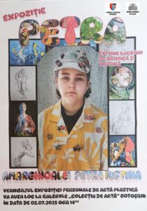 Muzeul Județean Botoșani găzduiește, în perioada 2-14 iulie 2025, în spațiul Colecției de Artă, expoziția de artă plastică ,,Petraˮ, cu lucrări de pictură și grafică semnate de Petra Iustina Amarghioalei. Expozanta, născută pe 10 septembrie 2009, este elevă în clasa a X-a la Liceul de Artă ,,Ștefan Luchanˮ din Botoșani și este îndrumată de profesorii Ciprian Andrușcă și Genoveva Dolhescu.