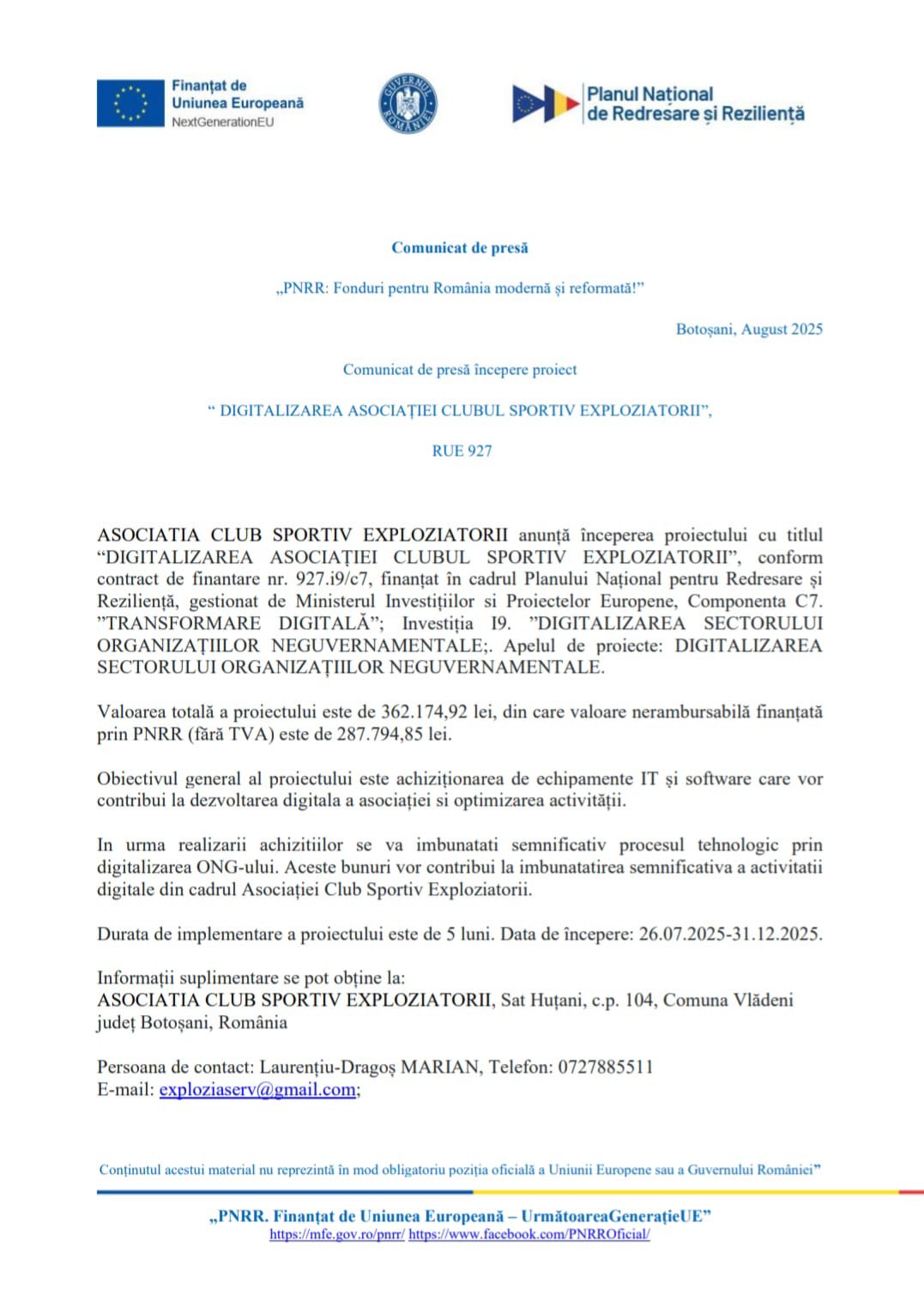 “DIGITALIZAREA ASOCIAȚIEI CLUBUL SPORTIV EXPLOZIATORII”, conform