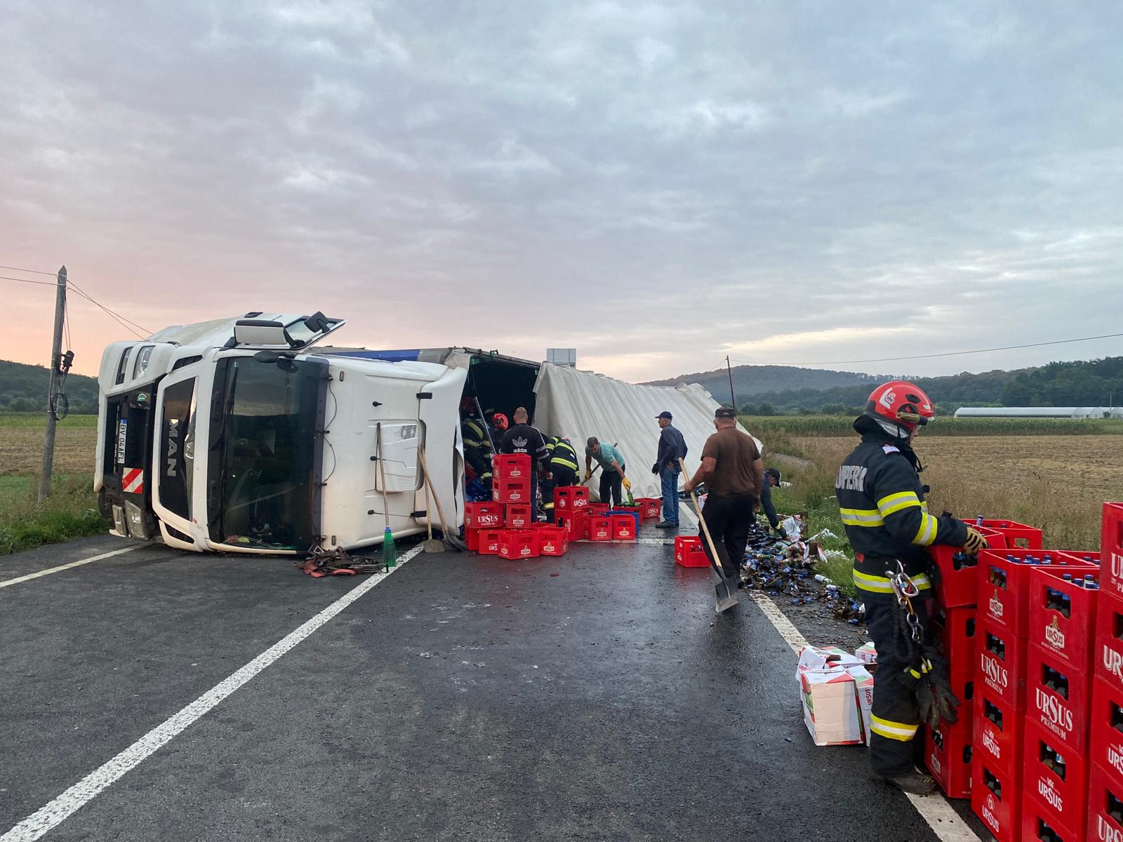 Un accident rutier a avut loc, în noaptea de marți spre miercuri, pe E 58, în localitatea Copălău din județul Botoșani. Un tir încărcat cu 24 tone de bere s-a răsturnat pe partea carosabilă, blocând circulația în zonă.