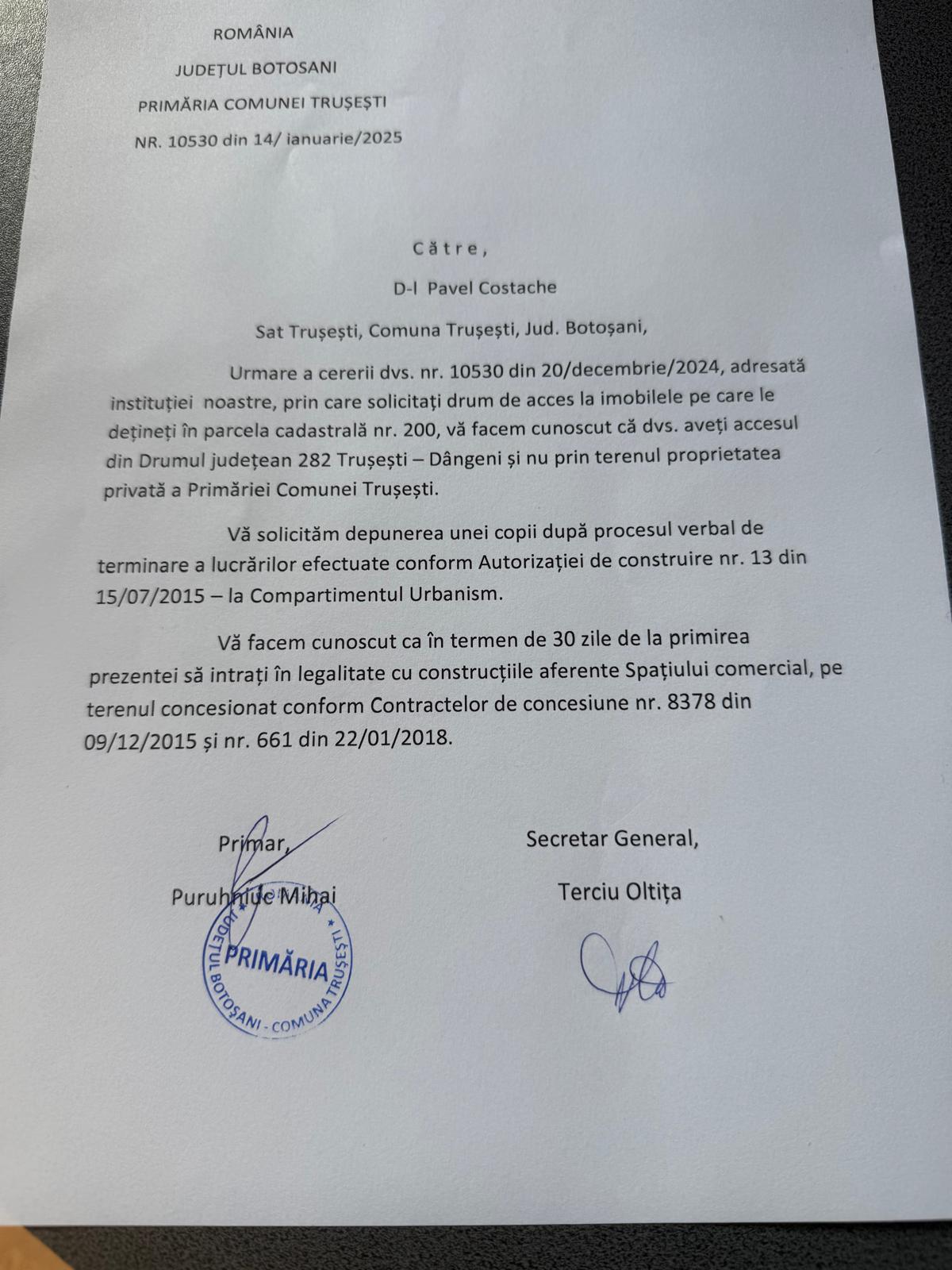 „Nici vorbă de așa ceva”, se apără primarul, care arată un document prin care i se pune în vedere patronului că are acces prin drumul județean și nu prin curtea Primăriei.