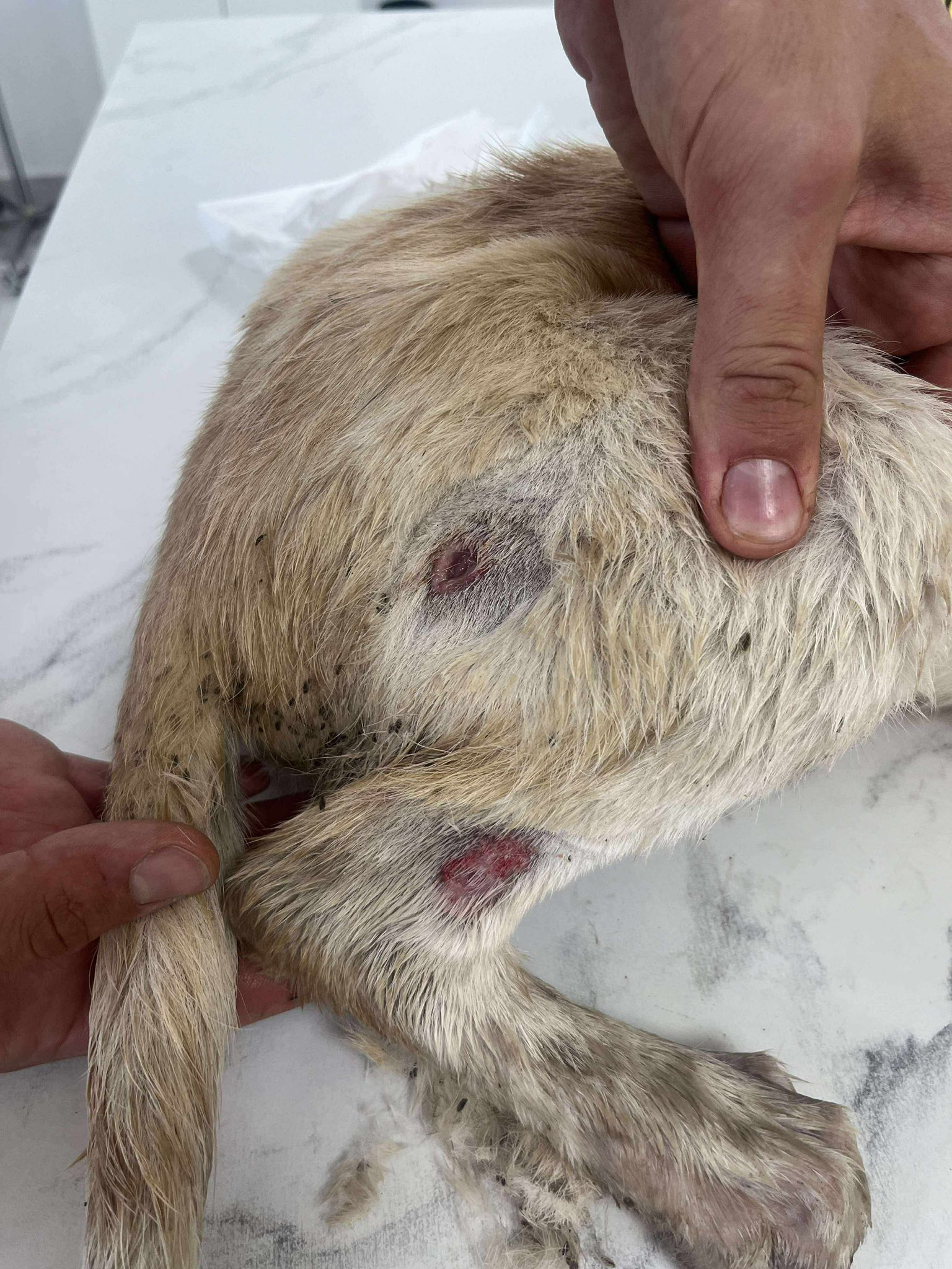 „Cățelul este la noi în acest moment internat împreună cu el a mai fost adus încă un câine fratele lui probabil ce se afla tot în curtea bătrânei și mulțumim pentru asta Biroului pentru Protecției Animalelor, am apreciat foarte mult ca nu au mai lăsat niciun alt câine în acea curte sa să fie abuzat. Starea lor este una foarte proasta, sunt foarte slabi, parazitați și plini de scaieți. Cățelul tarat are urme de înțepături de furcă sau alt obiect contondent pe corp, o hemoragie intraoculară fie datorită unei lovituri sau a fost sugrumat. A primit tratament și vor fi bine”, susțin medicii veterinari.