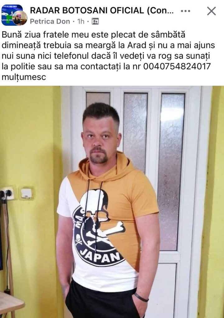 „Trebuia să meargă la Arad și nu a mai ajuns, nu-i sună telefonul. Dacă îl vedeți vă rog să sunați la poliție”, este mesajul postat pe rețelele de socializare de Petrică Don.