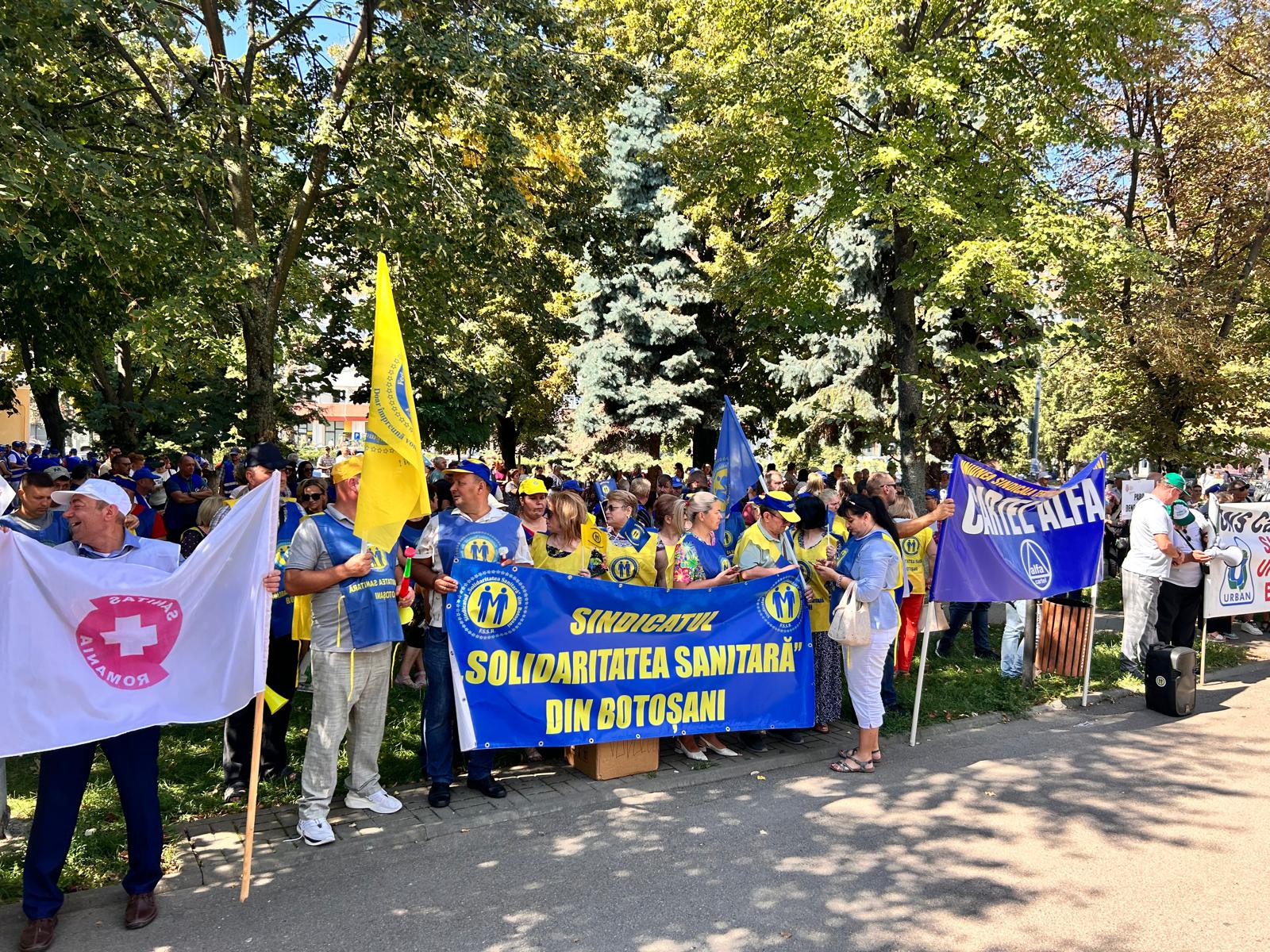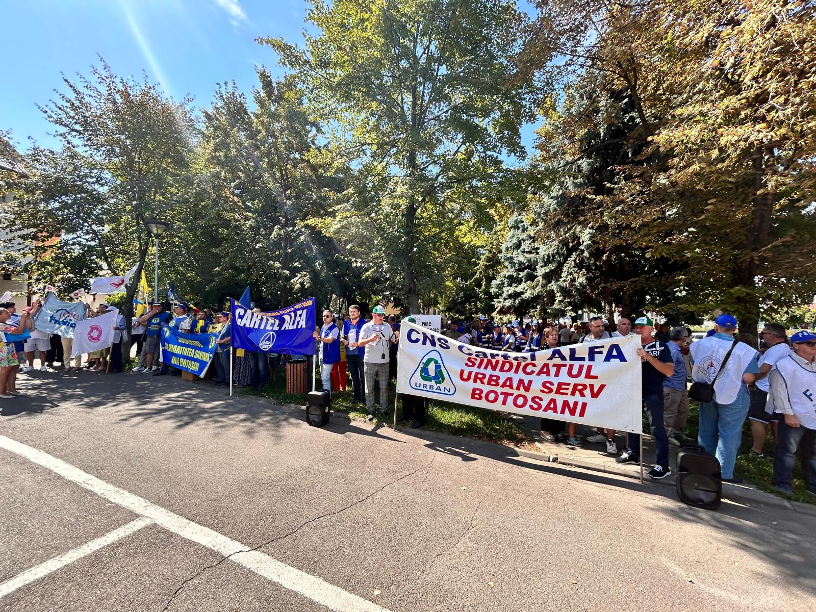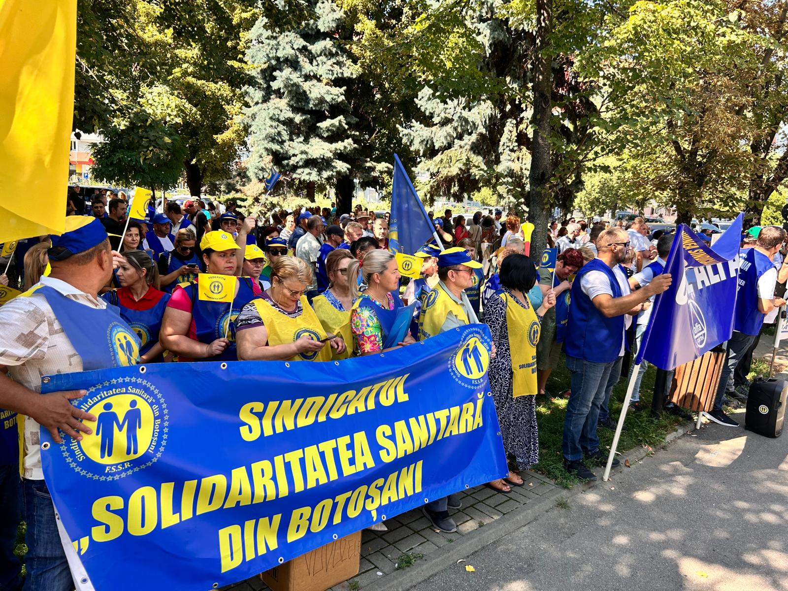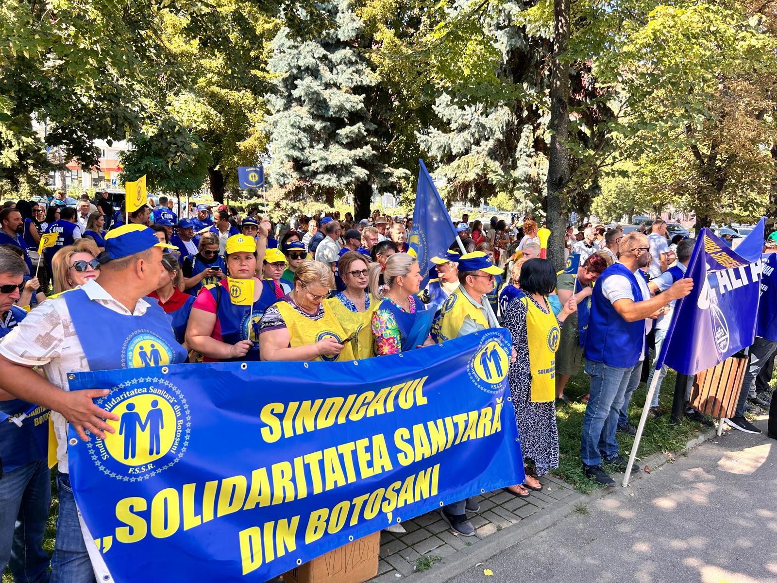 Un protest de amploare cu sute de sindicaliști a avut loc, miercuri, în municipiul Botoșani. Angajații statului au pichetat sediul temporar al Instituției Prefectului timp de două ore, în intervalul 11.00- 13.00, nemulțumiți de măsurile luate de Guvernul Bolojan.