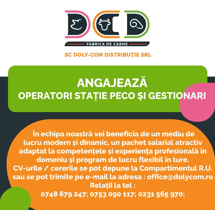 CV-urile/ cererile se pot depune la Compartimentul R.U. sau se pot trimite pe e-mail la adresa office@dolycom.ro. Relații la tel 0748679247, 0753090117, 0231565970