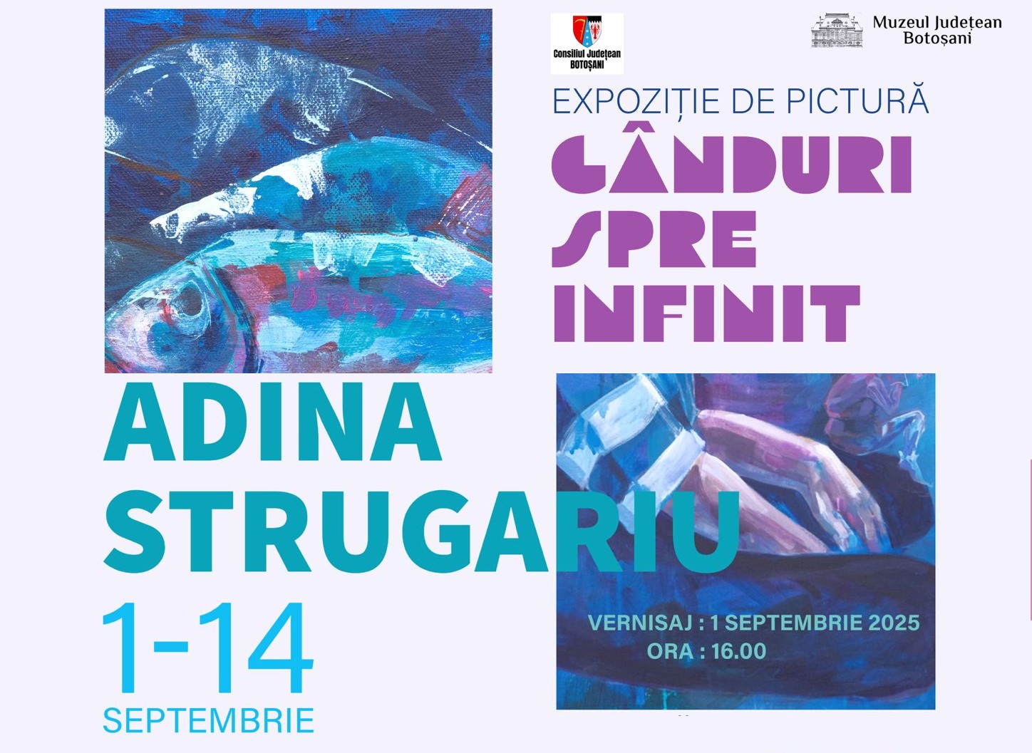 Muzeul Județean Botoșani găzduiește, în perioada 1-14 septembrie 2025, la Galeria „Colecția de Artă”, expoziția de pictură „Gânduri spre infinit”, cu lucrări semnate de artista Adina Strugariu. Prin cele 33 de creații artistice, realizate în tehnica acrilic pe pânză, în maniere diferite, de la pete transparente la tușe consistente, trasate energic în pensulă și cuțit, Adina Strugariu – aflată la prima expoziție personală – propune o incursiune inedită într-o lume a trăirilor interioare inspirate din realitatea cotidiană, transfigurată prin abordarea neconvențională.
