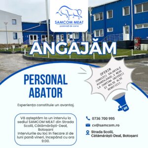 Societatea comercială Samcom Meat Botoșani caută personal pentru abatorul din Cătămărăști Deal. Interviurile au loc în fiecare zi, de luni până vineri, începând cu ora 9,00, la sediul din Cătămărăști Deal- strada Școlii.