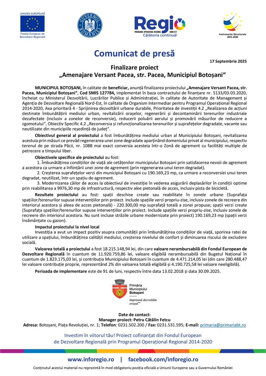 MUNICIPIUL BOTOȘANI, în calitate de beneficiar, anunță finalizarea proiectului „Amenajare Versant Pacea, str. Pacea, Municipiul Botoșani“, Cod SMIS 127784, implementat în baza contractului de finanțare nr. 5133/03.03.2020, încheiat cu Ministerul Dezvoltării, Lucrărilor Publice și Administrației, în calitate de Autoritate de Management și Agenția de Dezvoltare Regională Nord-Est, în calitate de Organism Intermediar pentru Programul Operațional Regional 2014-2020, Axa prioritară 4 – Sprijinirea dezvoltării urbane durabile, Prioritatea de investiții 4.2 „Realizarea de acțiuni destinate îmbunătățirii mediului urban, revitalizării orașelor, regenerării și decontaminării terenurilor industriale dezafectate (inclusiv a zonelor de reconversie), reducerii poluării aerului și promovării măsurilor de reducere a zgomotului“, Obiectiv Specific 4.2 „Reconversia și refuncționalizarea terenurilor și suprafețelor degradate, vacante sau neutilizate din municipiile reședință de județ“.