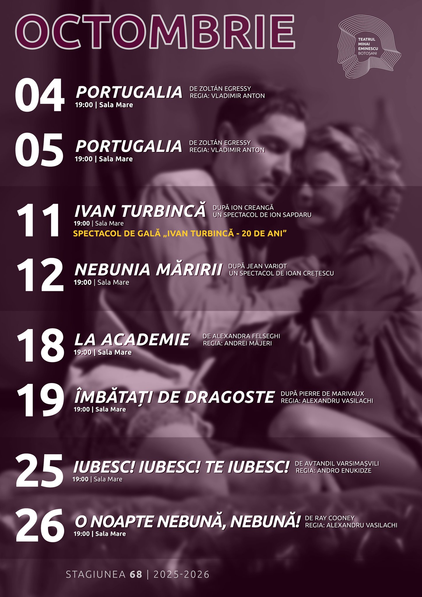 Reprezentanții Teatrului „Mihai Eminescu” din Botoșani au anunțat programul spectacolelor care vor avea loc în luna octombrie. Potrivit acestora, toamna aduce pe scenă emoție, comedie, povești captivante și actori îndrăgiți.