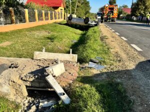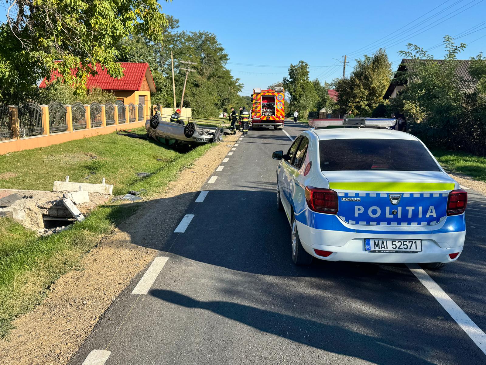 Doi copii și tatăl lor au ajuns la spital după ce mașina condusă de bărbat a lovit un cap de pod și s-a răsturnat pe cupolă. Accidentul a avut loc, sâmbătă, în localitatea Santa Mare.