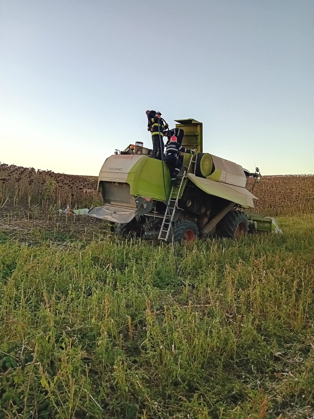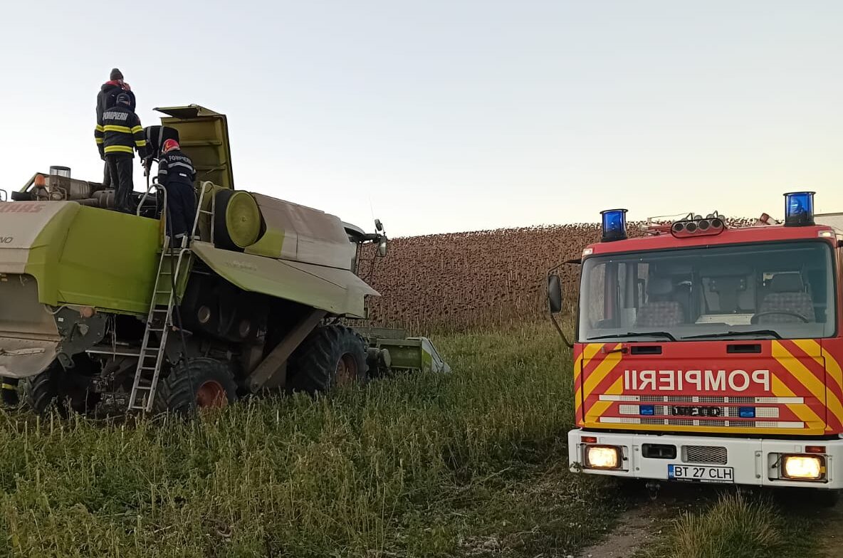 O combină agricolă a luat foc în timp ce treiera floarea-soarelui, sâmbătă după-amiază, pe un câmp din localitatea Hlipiceni. Șoferul a observat la timp fumul care ieșea din compartimentul motor, a oprit utilajul și a cerut sprijinul pompierilor.