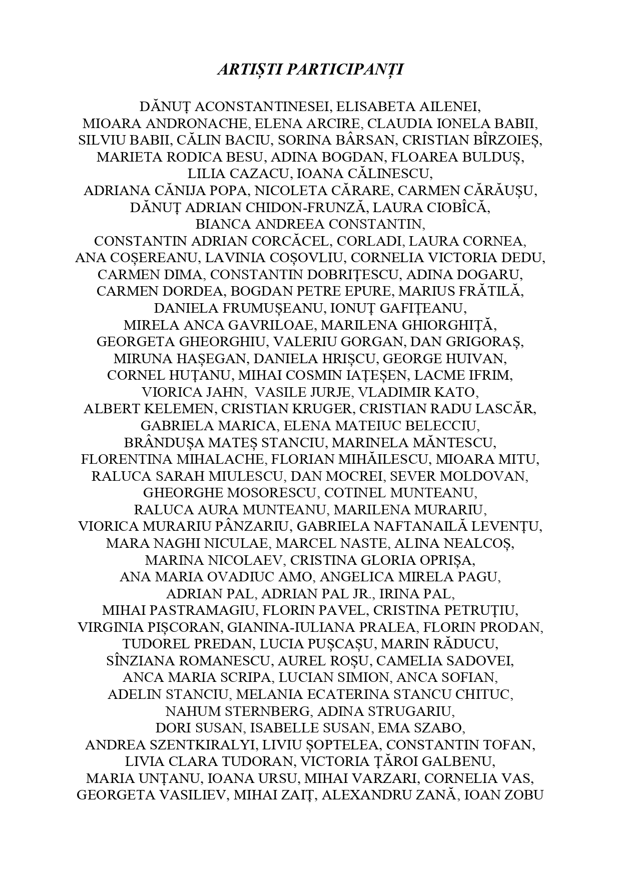 Expoziția, al cărei invitat de onoare este artistul român Constantin Tofan, vicepreședinte al Uniunii Artiștilor Plastici – Filiala Iași, reunește peste 100 de artiști plastici români contemporani, din diverse zone ale țării și din străinătate (Republica Moldova, Israel și SUA), aparținând unor școli și generații diferite.