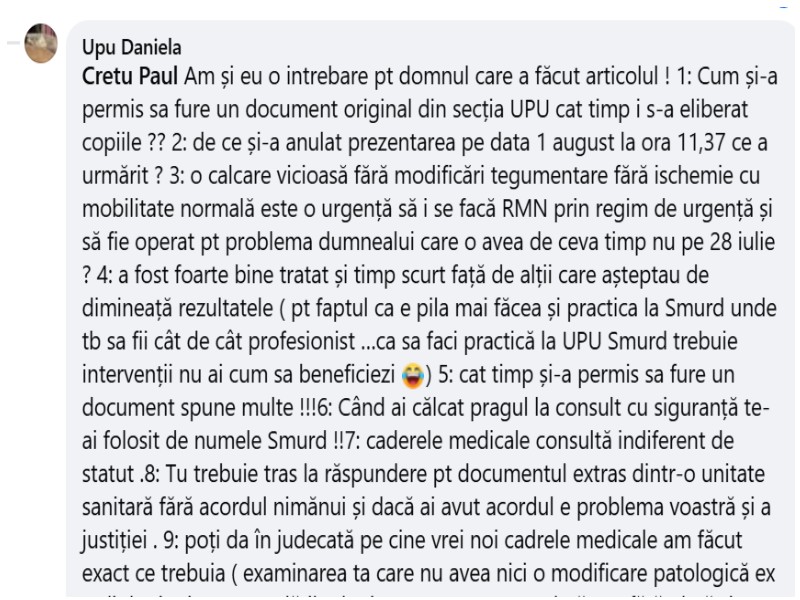 „1. Cum și-a permis sa fure un document original din secția UPU cat timp i s-a eliberat copiile ?? 2: de ce și-a anulat prezentarea pe data 1 august la ora 11,37 ce a urmărit ? 3: o calcare vicioasă fără modificări tegumentare fără ischemie cu mobilitate normală este o urgență să i se facă RMN prin regim de urgență și să fie operat pt problema dumnealui care o avea de ceva timp nu pe 28 iulie ? 4: a fost foarte bine tratat și timp scurt față de alții care așteptau de dimineață rezultatele ( pt faptul ca e pila mai făcea și practica la Smurd unde tb sa fii cât de cât profesionist …ca sa faci practică la UPU Smurd trebuie intervenții nu ai cum sa beneficiezi 5: cat timp și-a permis sa fure un document spune multe !!!6: Când ai călcat pragul la consult cu siguranță te-ai folosit de numele Smurd !!7: caderele medicale consultă indiferent de statut .8: Tu trebuie tras la răspundere pt documentul extras dintr-o unitate sanitară fără acordul nimănui și dacă ai avut acordul e problema voastră și a justiției . 9: poți da în judecată pe cine vrei noi cadrele medicale am făcut exact ce trebuia ( examinarea ta care nu avea nici o modificare patologică ex radiologic și recomandările de rigoare un RMN cu plată sau fără plată și consult ortopedic . Apropo ați fost pe data de 6 august la ortoped el de ce nu a văzut nici o modificare în timpul consultului ca să facă urgență să îți fi făcut internare de zi și să te opereze??? Îți răspund eu : genunchiul tău arată bine fără edem fără modificări de mobilitate fără modificări de ischemie așa ca te a trimis să îți faci un RMN . Problema ta cu genunchiul e de mult și nu acut pe 28 iulie 1 august și 6 august . Mai am o întrebare cine te a programat la Iași să fii operat cine a intervenit pt tine ca pt familia mea cu aceeași problemă am așteptat 3 luni”, este mesajul transmis de medic, pe pagina de Facebook a BotosaniNews.