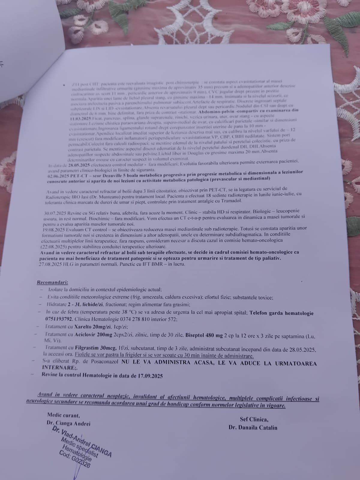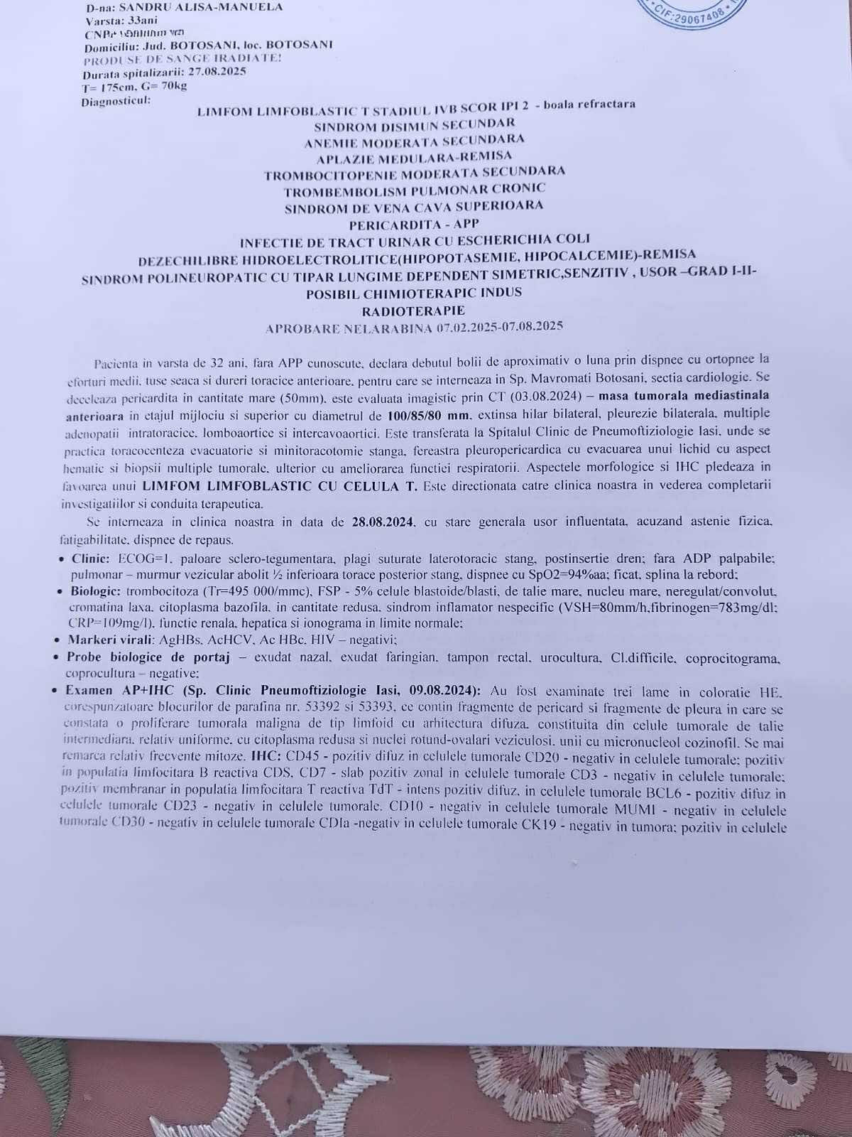 De mai bine de un an, viața ei a devenit o lupta neîntreruptă cu o boală cumplită:Limfom limfoblastic T, stadiul IVB, o formă agresivă de cancer care i-a afectat grav organismul.
