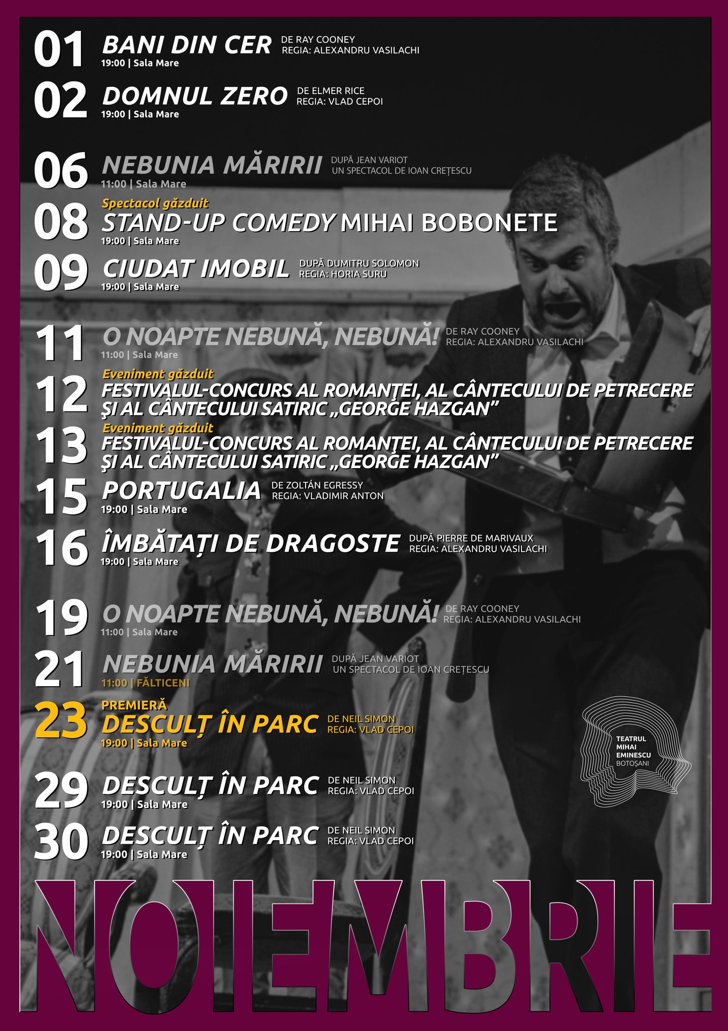 Teatrul „Mihai Eminescu” din Botoșani a anunțat programul spectacolelor pentru luna noiembrie. Reprezentanții unității de cultură promit o lună plină de emoție, cu mult râs și povești spuse pe scenă.