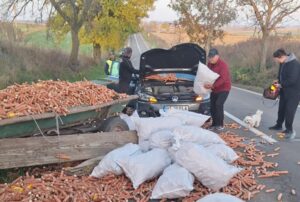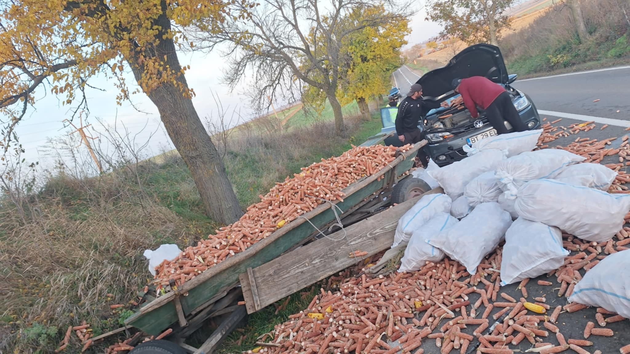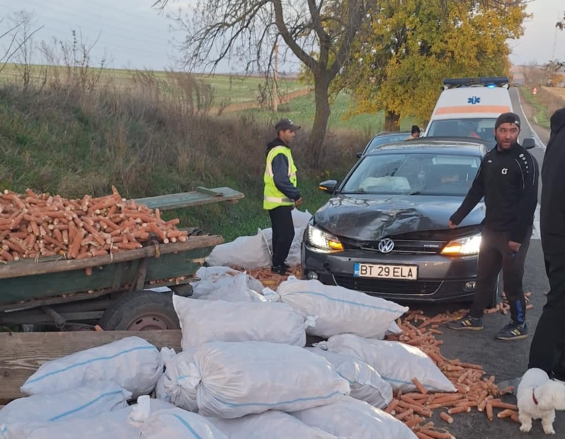Un accident rutier s-a produs, duminică după-amiază, pe drumul național DN 29 care face legătura în Botoșani și Săveni. Un autoturism Volkswagen Golf a intrat într-o căruță care transporta porumb. Mașina se deplasa în spatele atelajului, iar șoferul nu a observat-o intrând direct în aceasta.