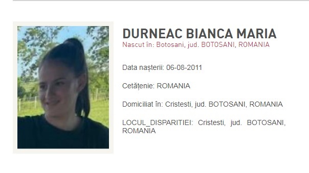 Una dintre cele trei fete din județul Botoșani care au fost date dispărute, miercuri, de polițiști a fost găsită. Este vorba de Bianca Maria Durnac, de 14 ani, din comuna Cristești, care a fost găsită pe raza localității de domiciliu.