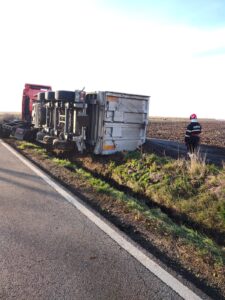 Un accident rutier a avut loc, vineri, pe un drum național din județul Botoșani. Accidentul s-a produs pe DN 24, pe ruta Botoșani – Săveni, unde un camion încărcat cu aproximativ 25 de tone de semințe de floarea-soarelui s-a răsturnat în afara părții carosabile.