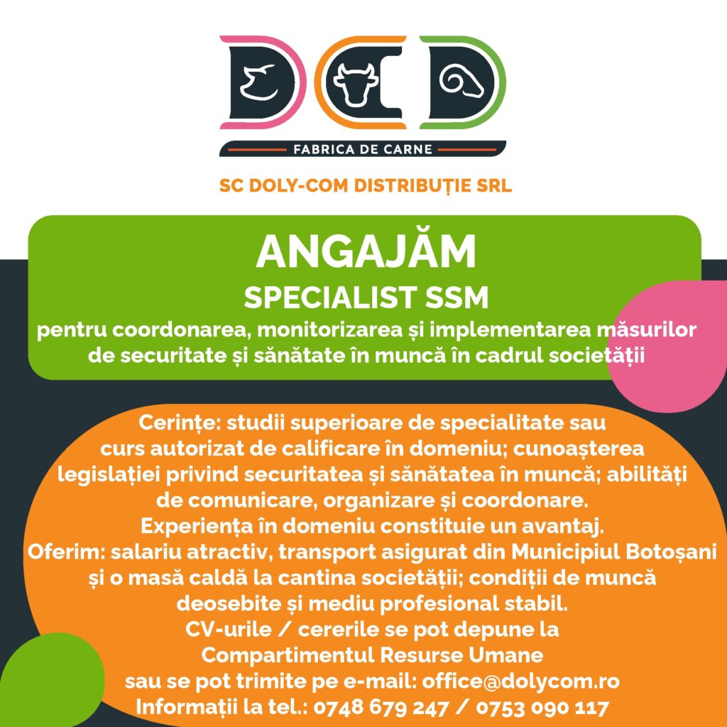 Societatea comercială Doly Com Distribuție SRL Botoșani angajează specialist SSM pentru coordonarea, monitorizarea și implementarea măsurilor de securitate și sănătate în muncă în cadrul societății