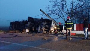 Reamintim că evenimentul s-a produs pe drumul judetean Botoșani- Vorona, în curba de la intersecţia cu drumul spre Mesteacăn. Un camion încărcat cu cereale a ieșit de pe drum și a distrus un gard și a rupt un stâlp din beton de energie electrică. Ulterior, mastodontul s-a răsturnat.