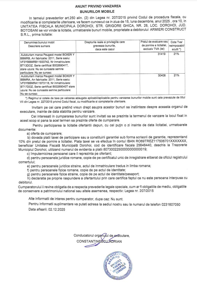 Unitatea Fiscală Municipală Dorohoi organizează, în data de 15 decembrie 2025, ora 10.00, în Unitatea Fiscală Municipală Dorohoi, str. Grigore Ghica, nr. 28, localitatea Dorohoi, judeţul Botoşani, licitatie publică în vederea valorificării bunurilor mobile conform anunţului de vânzare nr. 207-14 din 05 noiembrie 2025, prima licitatie.