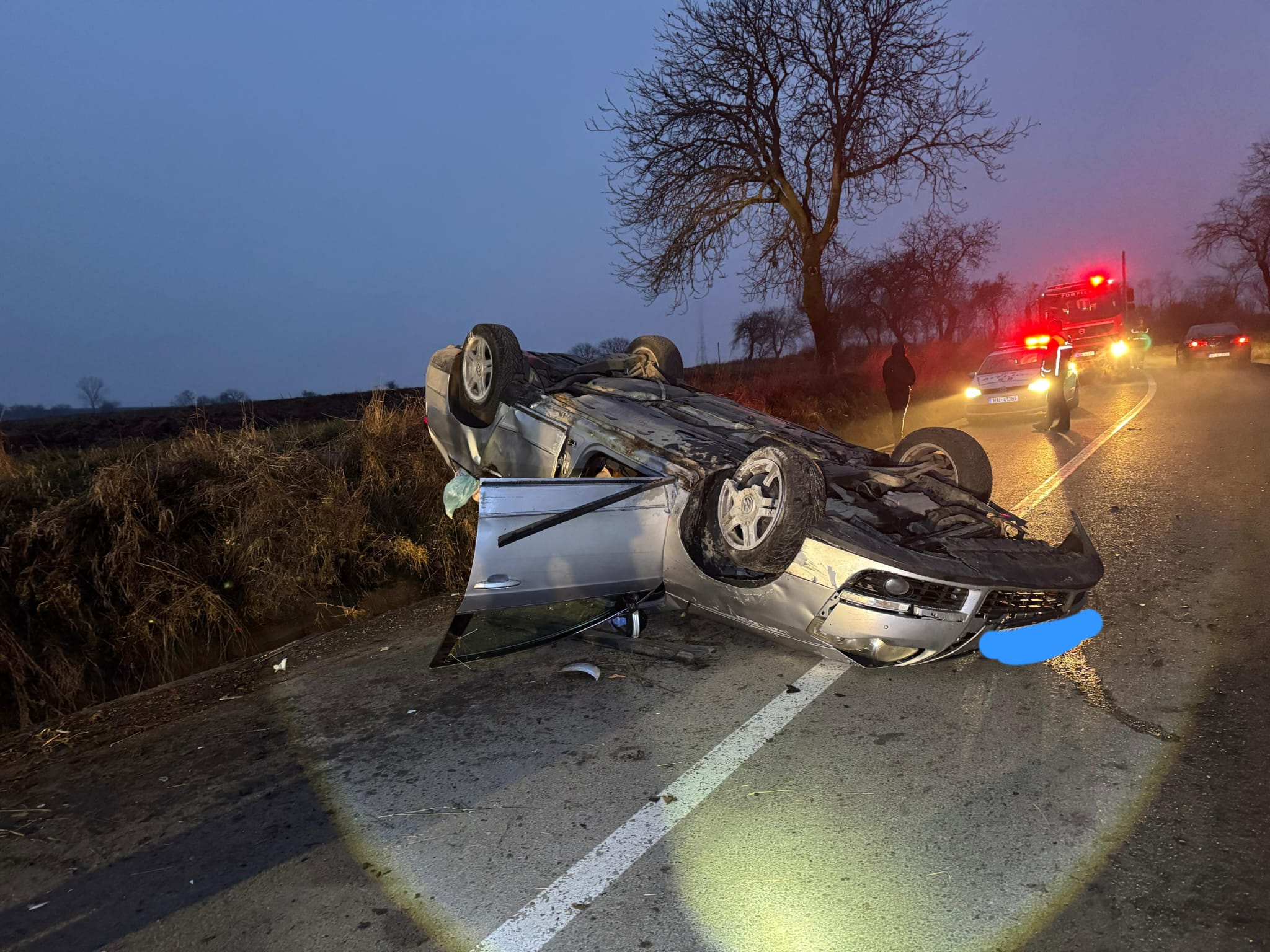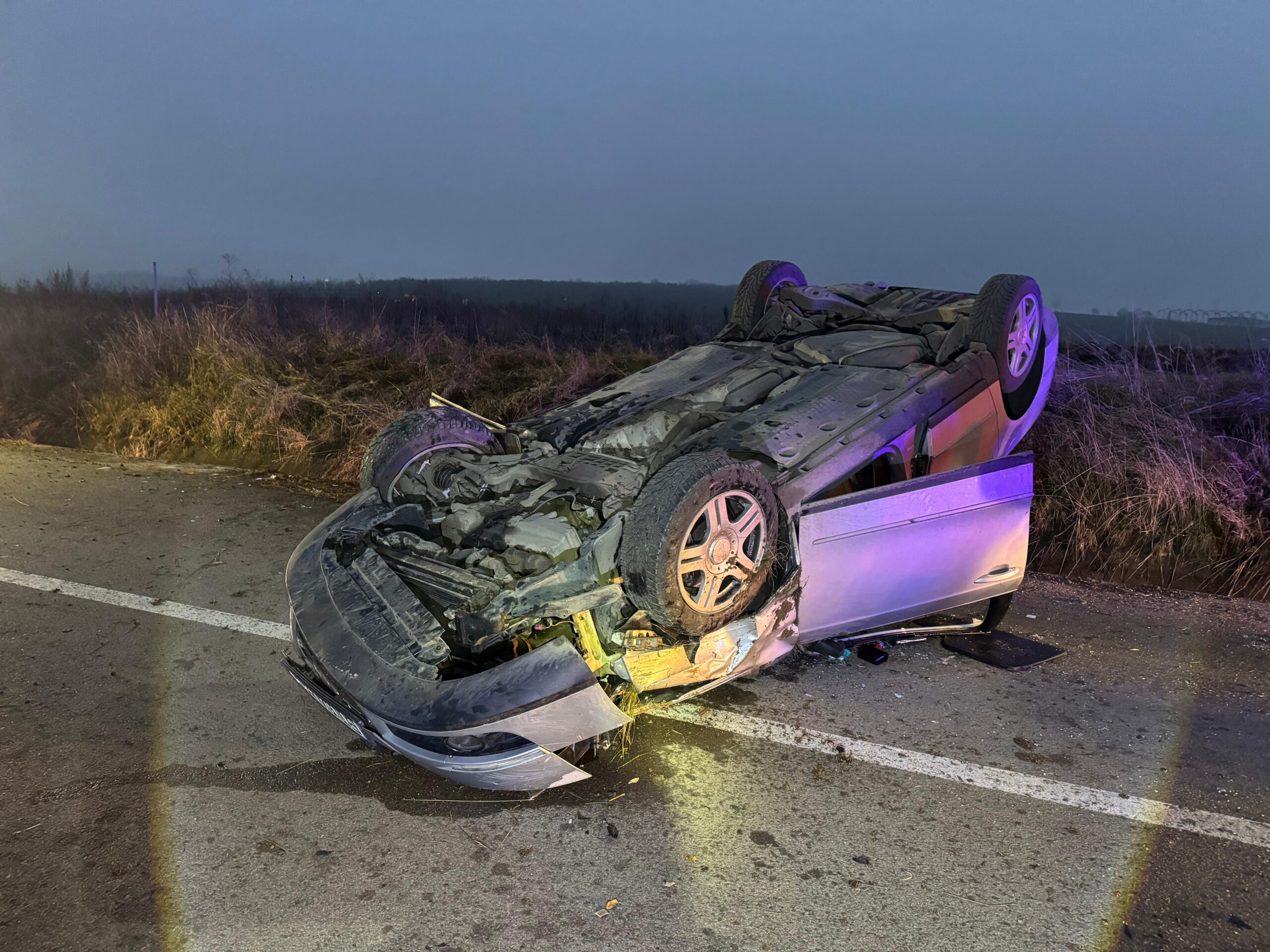 Aceștia au constatat faptul că autoturismul era pe partea carosabilă, răsturnat pe cupolă și că nu erau persoane încarcerate.