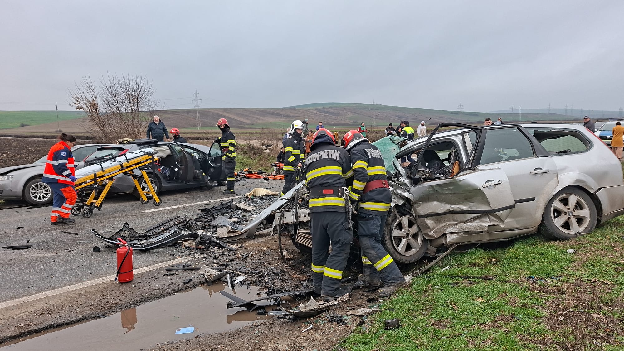 Din spate a venit cu mașina un al treilea șofer, care a depășit mașinile avariate și s-ar fi uitat la ele. Într-o secundă a pierdut controlul direcției, s-a răsucit pe carosabil și a lovit în plin un al patrulea autoturism care venea pe contrasens, potrivit stirileprotv.ro.