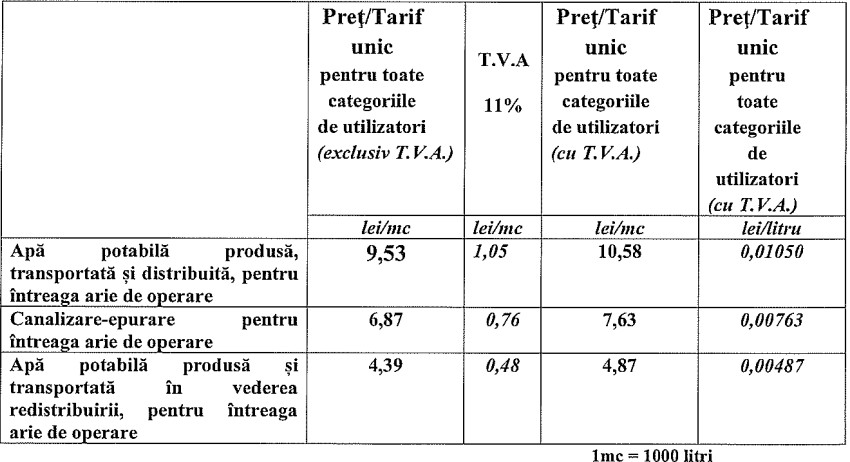 - tariful de canalizare-epurare se va modifica de la 6,20 lei/mc fără T.V.A 6,87 lei/mc fără T.V.A, ceea ce înseamnă o majorare cu 10,81%;