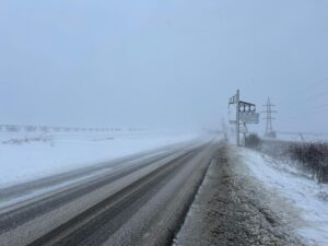La intrarea în judeţ, dinspre Siret, carosabilul este acoperit cu zăpadă şi vizibilitatea foarte scăzută. Un utilaj de deszăpezire patrulează în zonă, dar nu face faţă intensităţii vântului.