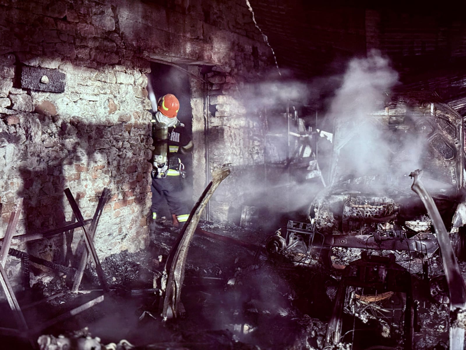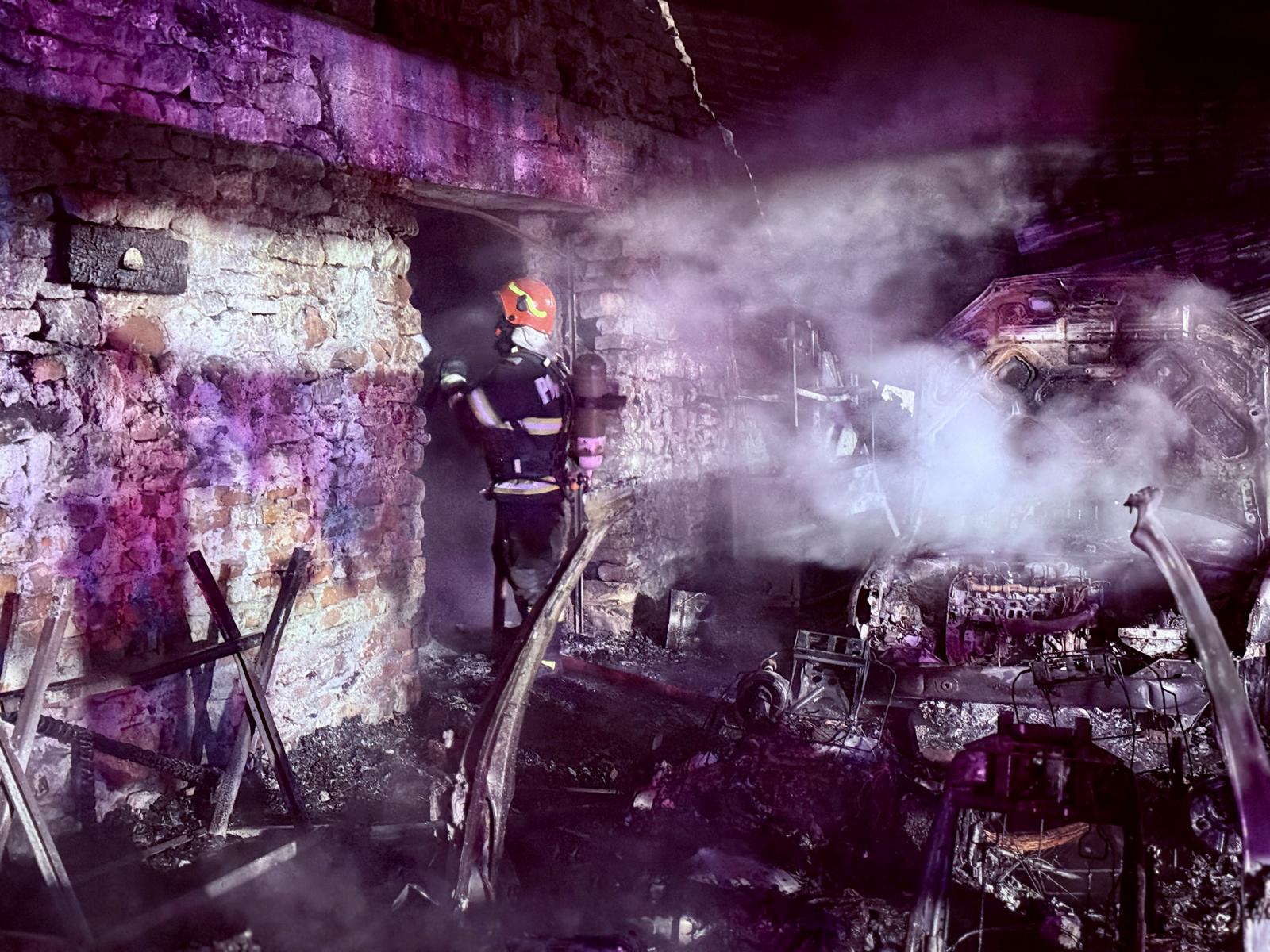 Au ars bucătăria de vară, două autoturisme, un compresor, mai multe unelte de construcții și tinichigerie auto, precum și o cantitate însemnată de materiale combustibile din lemn și plastic aparținând primariei și care se aflau în interiorul halei.