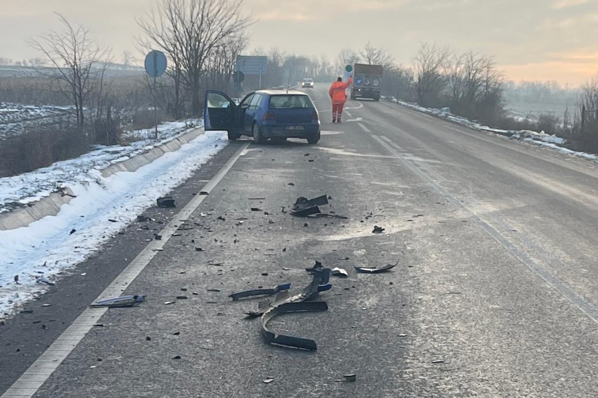 În accident au fost implicate o autoutilitară Ford şi un autoturism Volkswagen Golf. În urma impactului, autoutilitara a ieşit de pe carosabil şi s-a răsturnat pe partea dreaptă a drumului.