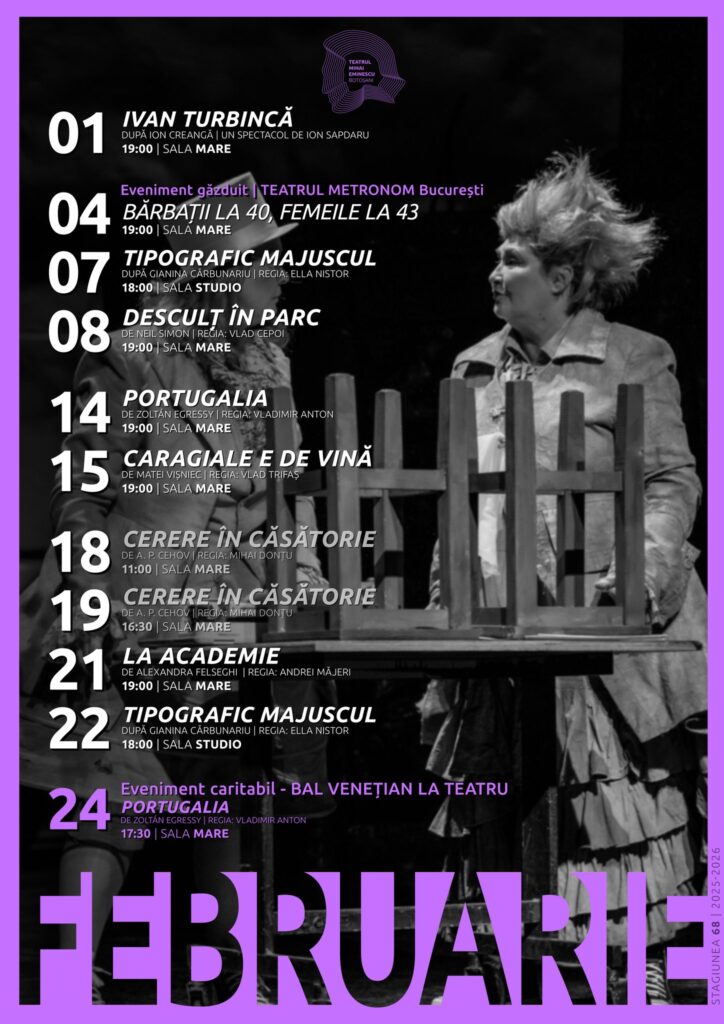 Teatrul „Mihai Eminescu” Botoșani a anunțat spectacolele lunii februarie.
