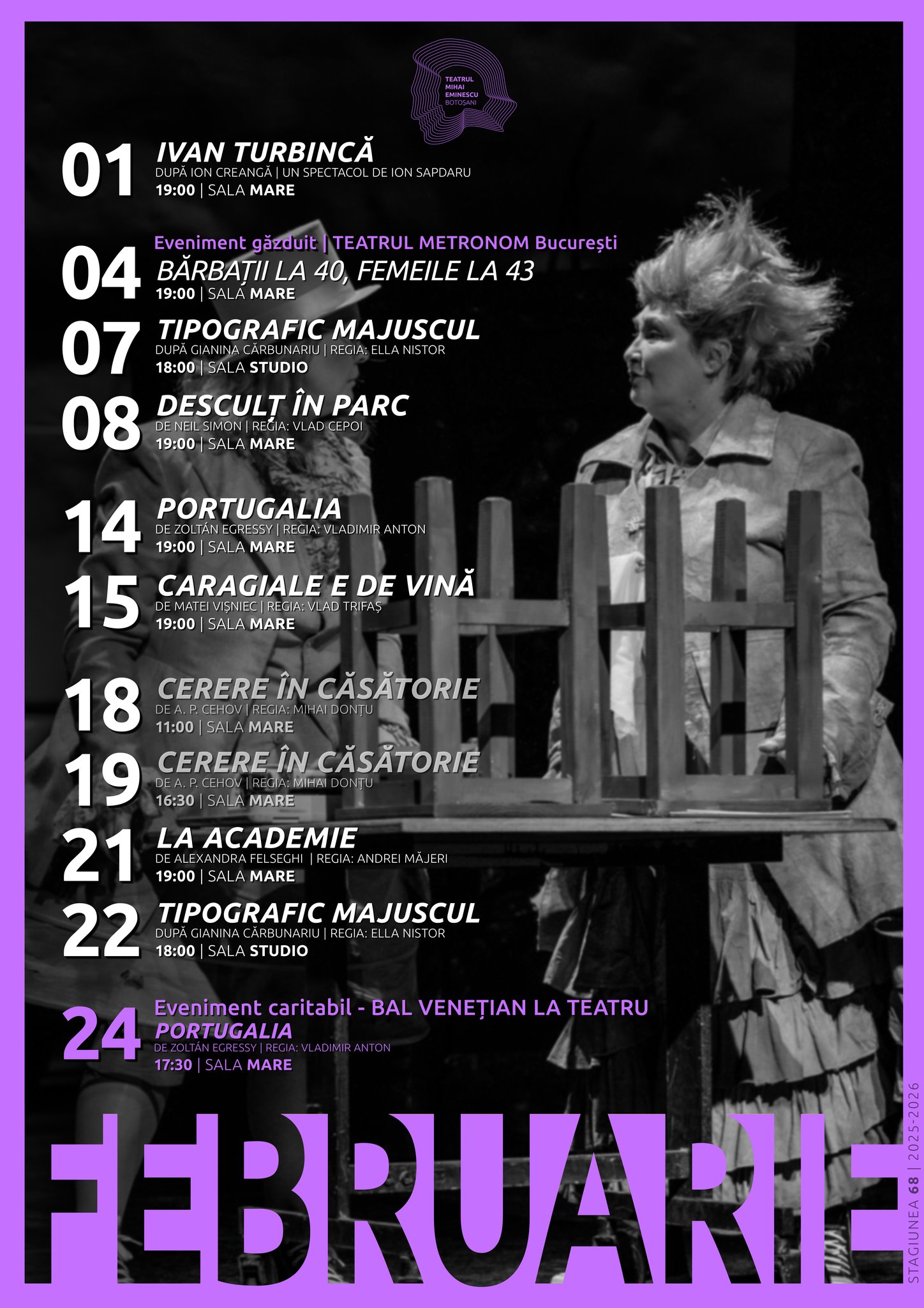 „Luna iubirii de teatru începe aici!  Râdem, ne emoționăm, reflectăm și ne bucurăm de povești spuse pe scenă, alături de actorii noștri. În februarie, te așteaptă spectacole pentru toate gusturile!”, anunță instituția de cultură.