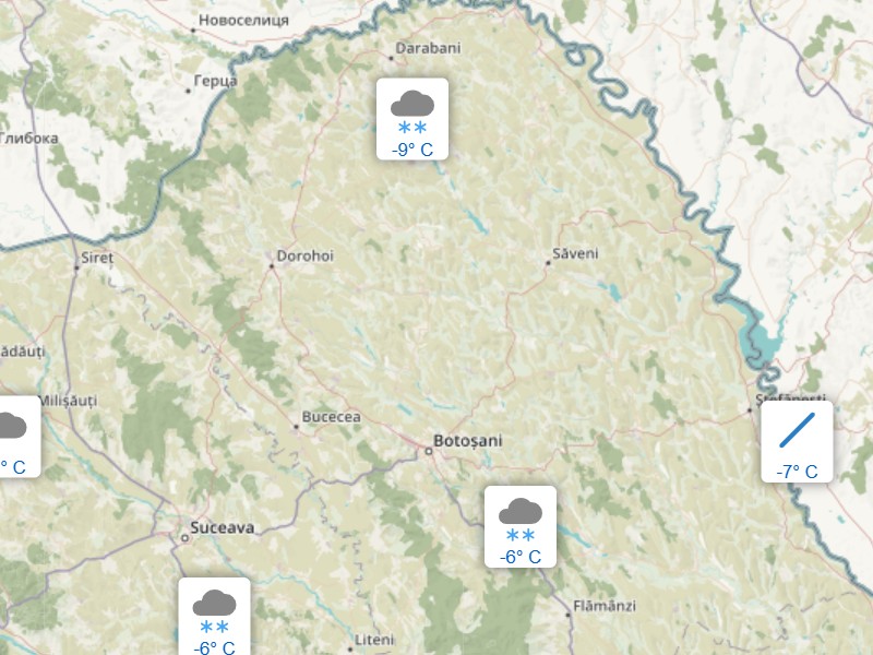 Botoşaniul era, sâmbătă dimineaţă, locul din ţară cel mai friguros, cu temperaturi de sub -9 grade Celsius, potrivit Administraţiei Naţionale de Meteorologie. La ora 8.00, la Staţia Meteo Darabani se înregistrau - 9,3 grade Celsius, în timp ce la Stânca (Ştefăneşti) erau la aceeaşi oră -7 grade.