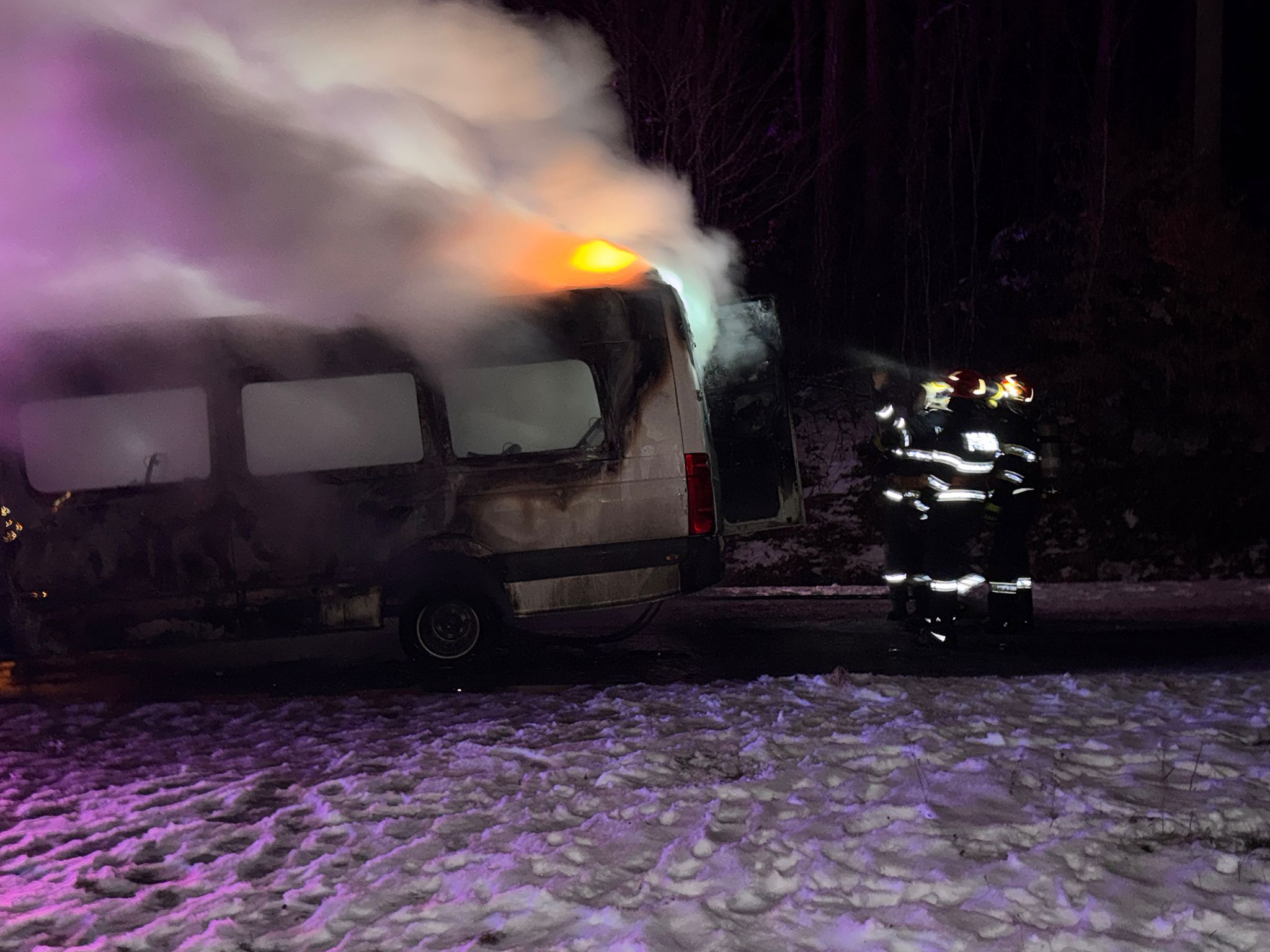 Un microbuz de transport persoane a luat foc, miercuri seară, între localitățile Ilișești și Păltinoasa din județul Suceava.