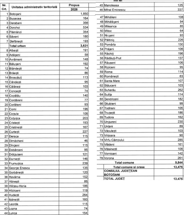 Având în vedere faptul că pentru sumele repartizate prin hotărâre a consiliului judeţean, în faza de propunere, nu există criterii de repartizare, se propune ca sumele pe anul 2026 şi estimările pe anii 2027 – 2029 comunicate prin adresa nr.II/39/02.02.2026 de către Administraţia Judeţeană a Finanţelor Publice Botoşani să fie repartizate ţinând cont de numărul locuitorilor fiecărei unităţi administrativ-teritoriale (50%) și de suprafaţa din intravilanul unităţilor administrativ-teritoriale (50%).