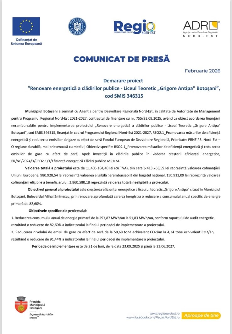 Municipiul Botoșani a semnat cu Agenţia pentru Dezvoltare Regională Nord-Est, in calitate de Autoritate de Management pentru Programul Regional Nord-Est 2021-2027, contractul de finanţare cu nr. 755/23.09.2025, având ca obiect acordarea finanţării nerambursabile pentru implementarea proiectului Renovare energetică a clădirilor publice – Liceul Teoretic Grigore Antipa” Botoșani”, cod SMIS 346315, finanţat in cadrul Programului Regional Nord-Est 2021-2027, RSO2.1_ Promovarea măsurilor de eficiență energetică și reducerea emisiilor de gaze cu efect de seră Fondul European de Dezvoltare Regională, Prioritate: PRNE.P3. Nord-Est- ○ regiune durabilă, mai prietenoasă cu mediul, Obiectiv specific: RSO2.1_Promovarea măsurilor de eficienţă energetică și reducerea emisiilor de gaze cu efect de seră, Apel: Investiții in clădirile publice in vederea creșteri eficienței energetice, PR/NE/2024/3/RS02.1/1/Eficienţă energetică Clădiri publice MRJ+M.