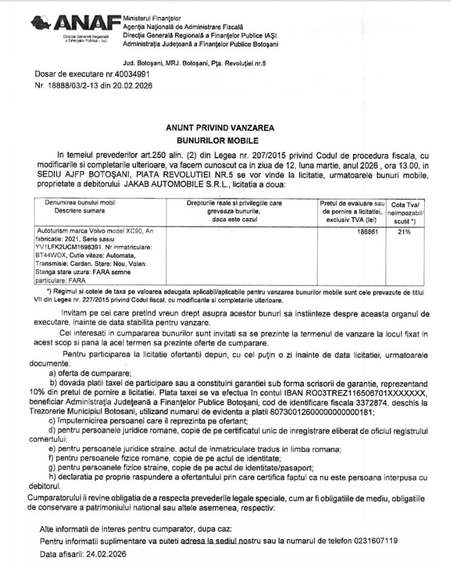 1 martie 2026 - Anunţ privind vânzarea unor bunuri mobile ale societăţii comerciale Jakab Automobile SRL Botoşani