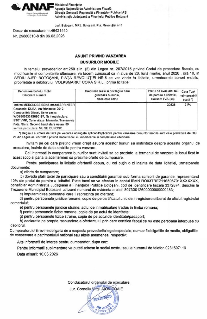 9 martie 2026 - Administrația Județeană a Finanțelor Publice Botoșani anunță vânzarea bunurilor mobile ale Volksmarkt Cora SRL