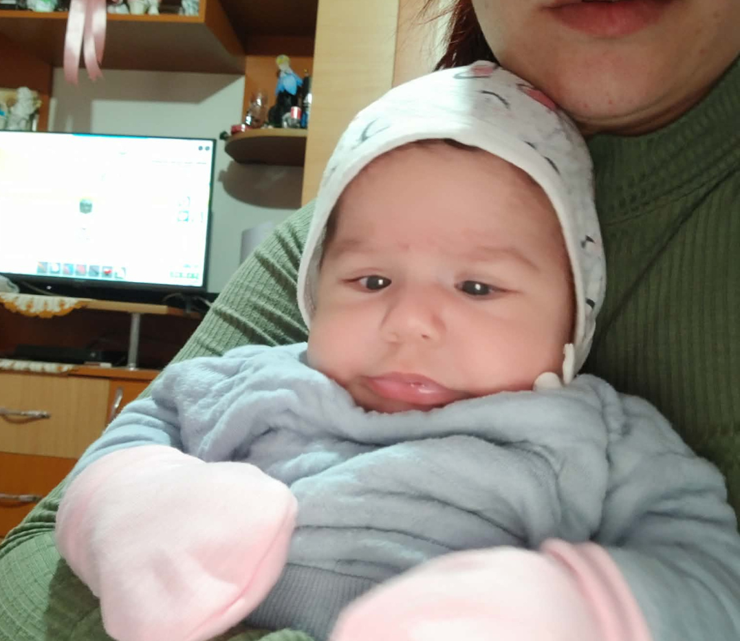 Mama ei, Ștefana, a observat într-o zi un punct alb în ochișorii fetiței în timp ce o ținea în brațe și o alăpta. A fost un detaliu mic, dar suficient cât să simtă că ceva nu este în regulă. A doua zi a ajuns la medic, iar după investigații și consulturi a primit un diagnostic greu pentru orice părinte: cataractă congenitală la ambii ochi.