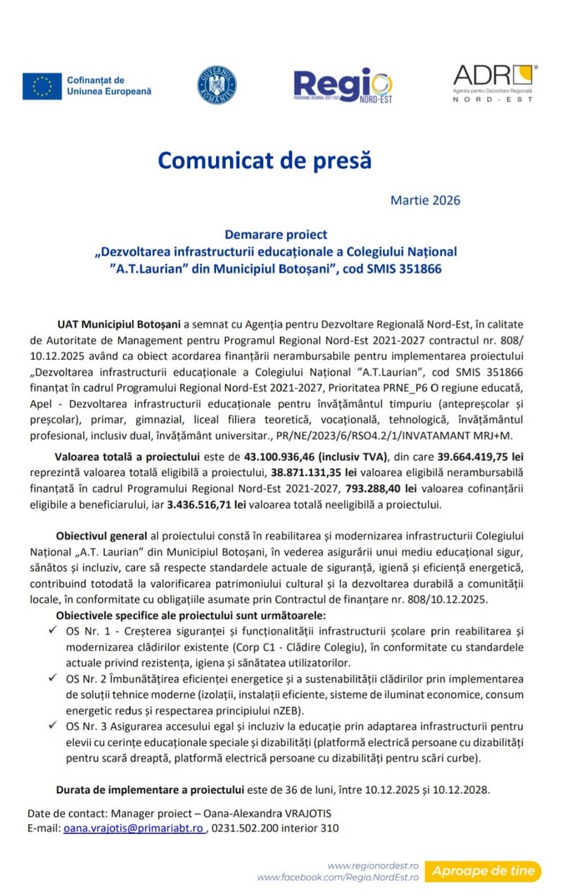 Comunicat de presă demarare proiect „Dezvoltarea infrastructurii educaționale a Colegiului Național ”A.T.Laurian” din Municipiul Botoșani”