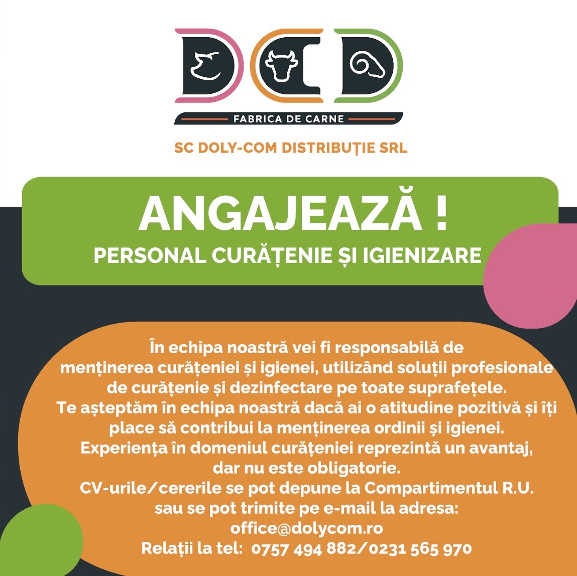 Doly- Com Distribuție Botoșani caută personal pentru curățenie și igienizare. În echipa noastră vei fi responsabilă de menţinerea curăţeniei si igienei, utilizând soluţii profesionale de curătenie si dezinfectare pe toate suprafetele. Te așteptăm în echipa noastră dacă ai o atitudine pozitivă şi îti place să contribui la menţinerea ordinii si igienei. Experienţa în domeniul curăţeniei reprezintă un avantaj, dar nu este obliaatorie.
