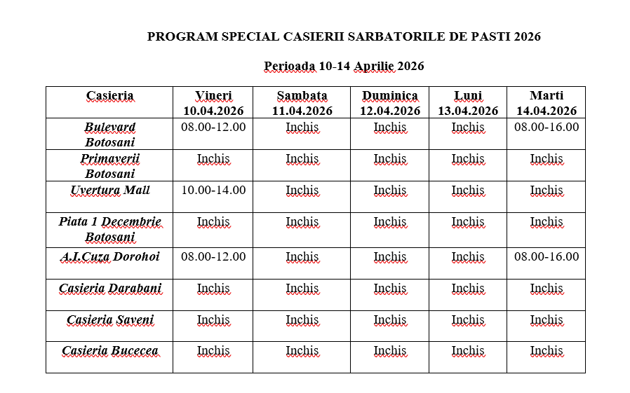 Programul casieriilor Nova Apaserv SA Botoșani în perioada sărbătorilor de Paște