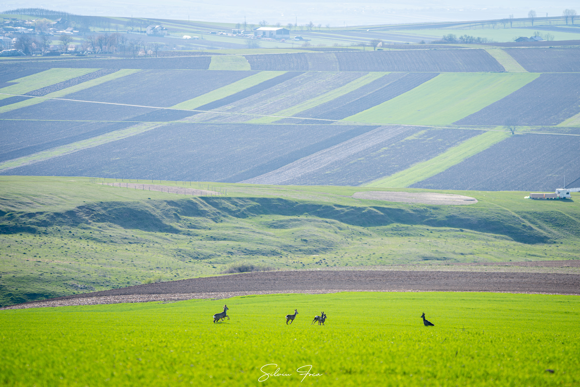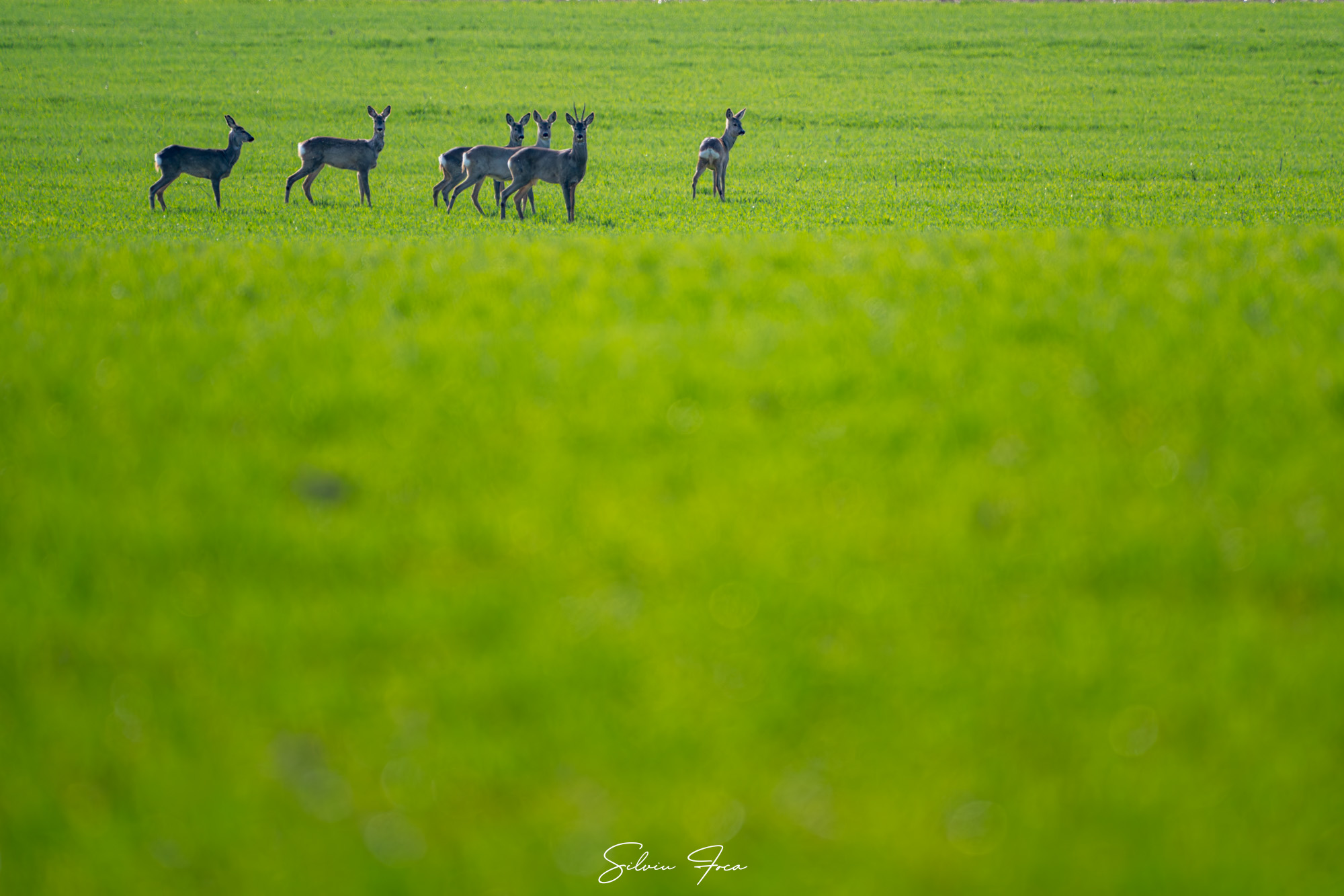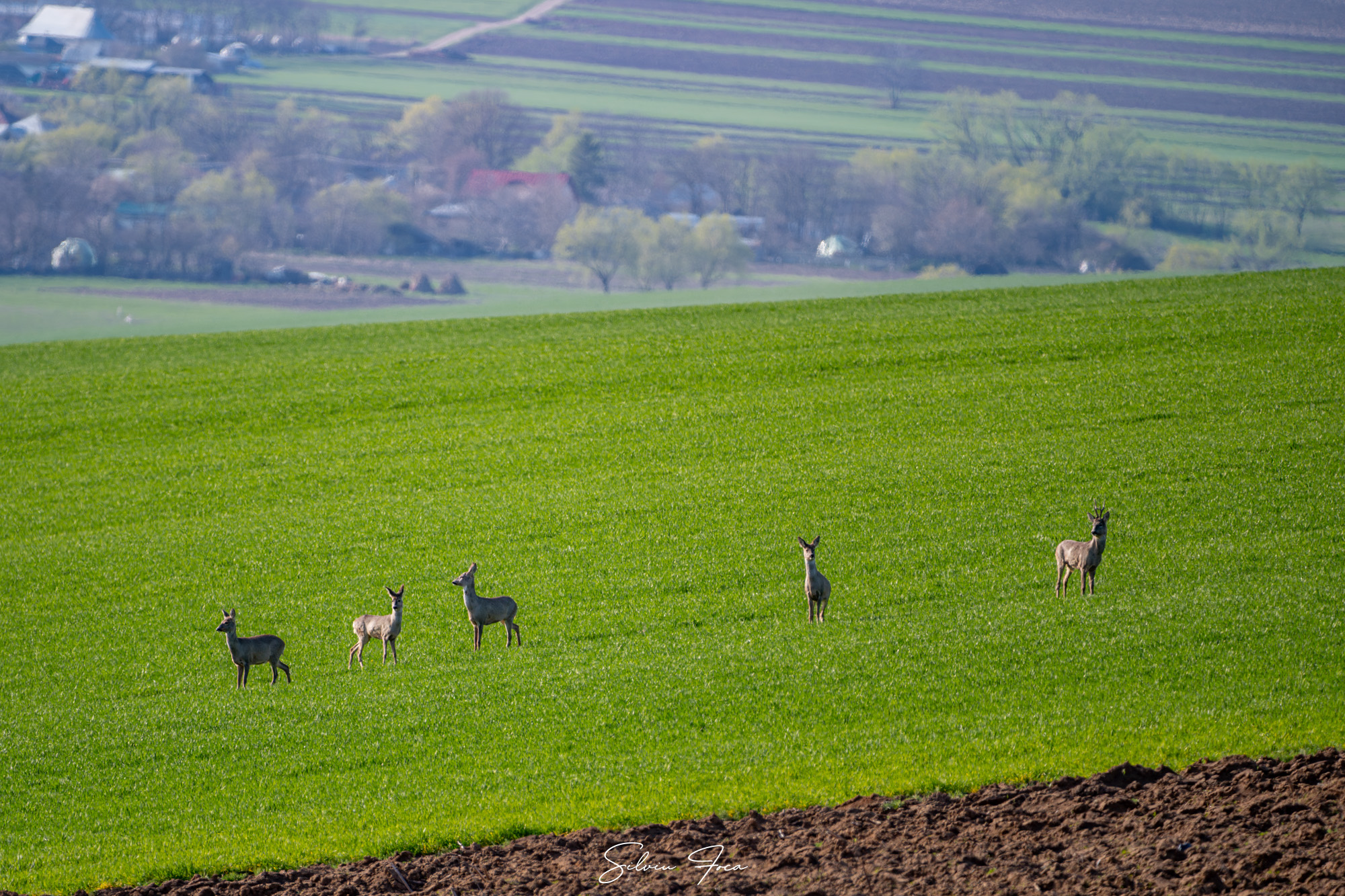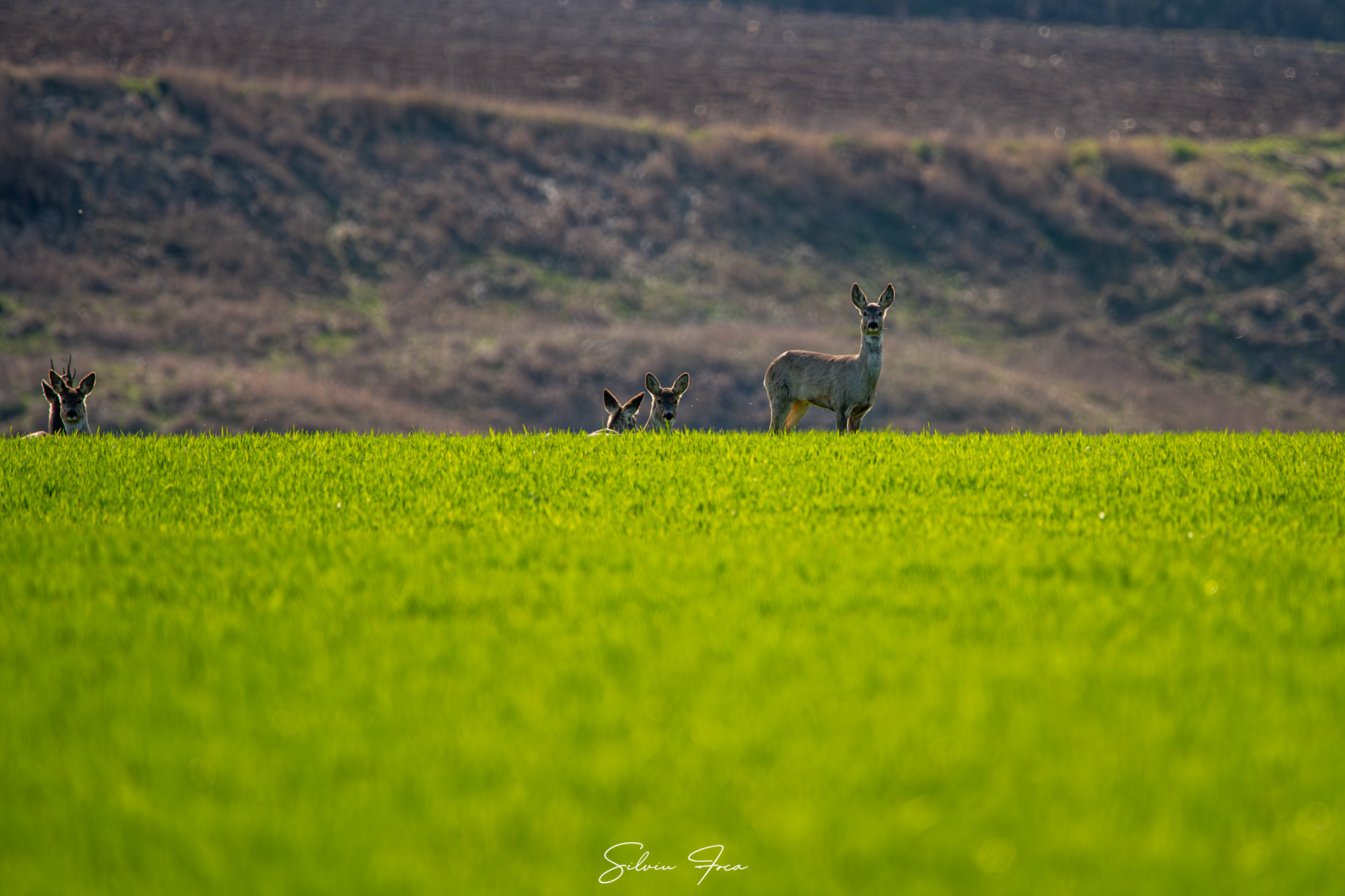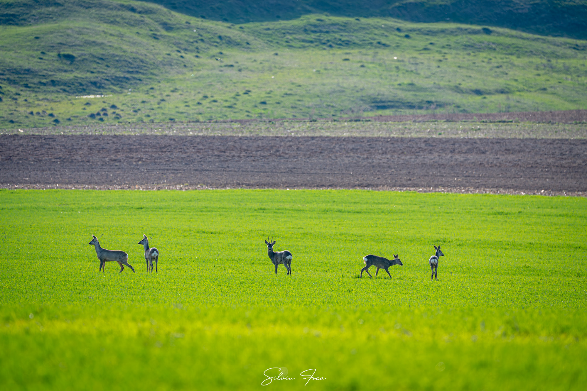 „Un grup de căprioare ieșite să se bucure de soare, de primăvară și de câmpurile prospăt înverzite. Am avut noroc să le zăresc cu coada ochiului din viteza mașinii și nu am ratat să le fac câteva cadre mai ales că lumina soarelui și culoarea câmpului erau spectaculoase. Iar ele au fost foarte îngăduitoare cu prezența mea încât am putut face și câteva incadrări mai speciale”, a precizat Silviu Foca.
